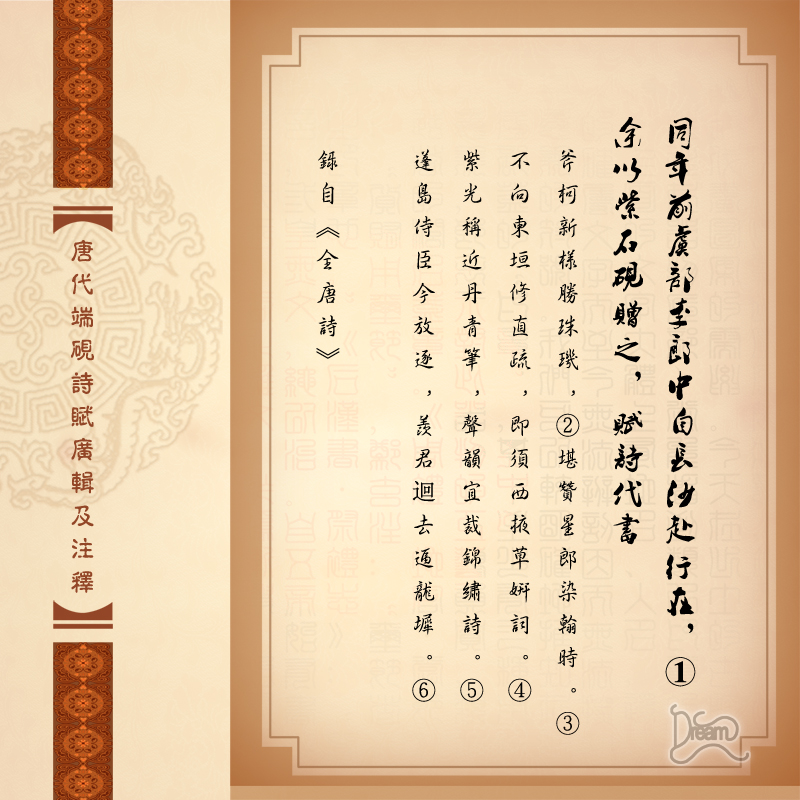 ①行在:帝王所在地,指京城。②斧柯:斧柯山,端硯產地。③堪贊句:李郎中用上這個端硯寫字,就更令人贊羨了。星郎:即郎官,指李郎中。染翰:用毛筆寫字。④不向二句:用這個端硯,到朝中可以用來寫奏疏公文和寫美麗的詞章。東垣、西掖:唐朝門下省、中書省,均為朝廷最高政務機構。直疏:直言奏章。⑤紫光二句:磨出最好的墨泛出紫色光彩,和彩筆最相合了,硯石的聲韻也最適宜寫出美麗的詩篇了。紫光:《墨經》:凡墨色,紫光為上。丹青:繪畫的顏色。⑥蓬島二句:我本是朝廷侍臣,現在已遭貶逐,倒是羡慕你回去京城了。蓬島:此處指蓬萊宮,唐時朝廷宮殿,此為泛指宮殿。逼:近。龍墀:皇宮的臺階。