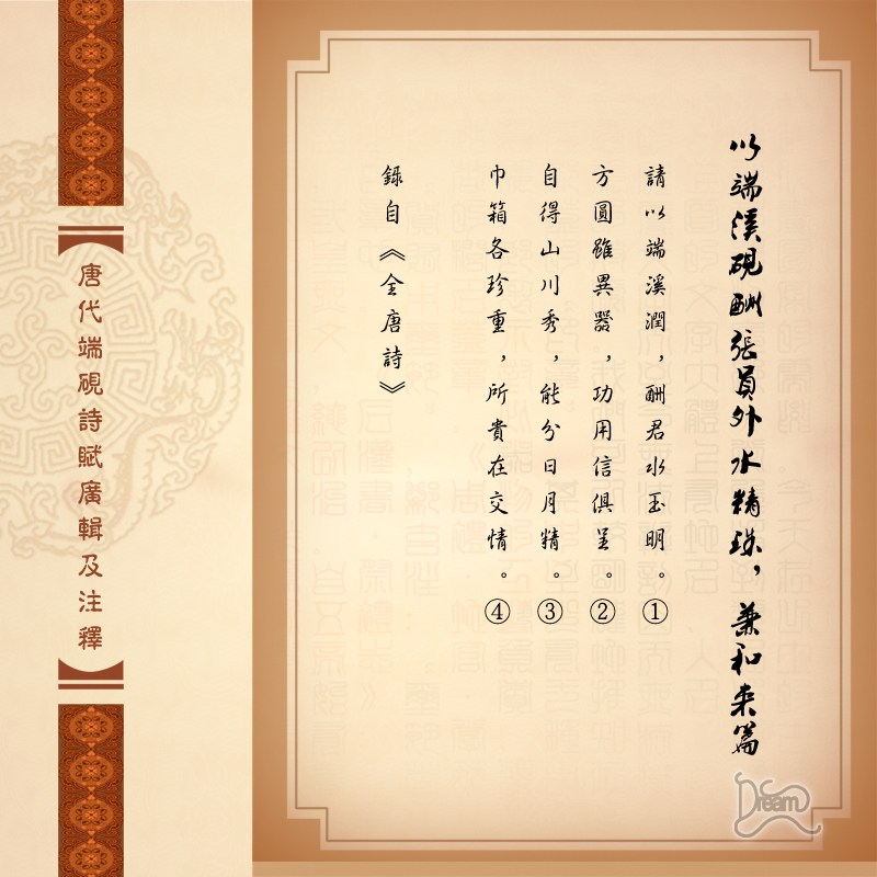①請以二句:我虔誠地用溫潤的端硯,答謝你送給我的水晶珠。②方圓二句:端硯是方的,水晶珠是圓的,兩者不同,但各有用處。③自得二句:端硯蘊涵著山川的秀麗,水晶珠則蘊涵著日月的精華。④巾箱二句:大家都把受贈的物品珍重保藏,不僅因為它名貴,更重要的是它寄託著我們彼此的友情。巾箱:古時用來存放頭巾、檔、書卷的小箱子。