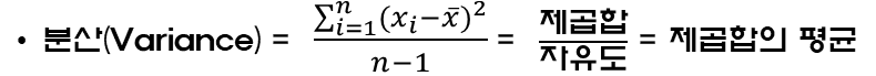 왜냐하면 앞의 계산에서 보았듯이, 분자부분은 자료의 값이 평균값으로부터 얼마나 먼 거리에 있는지의 합입니다. 이 거리의 합을 자료의 개수로 나누었으니, 분산이 의미하는 것은 자료의 값들이 평균값으로부터 평균적으로 얼마나 멀어져 있는가 입니다. 여기서 앞의 계산의 분자부분은 제곱합이라고 표현하고, 분모부분은 자유도라고 표현합니다. 제곱합은 이해가 되는데, 자유도는 어렵지요? 다음에 기회가 있을 겁니다.
