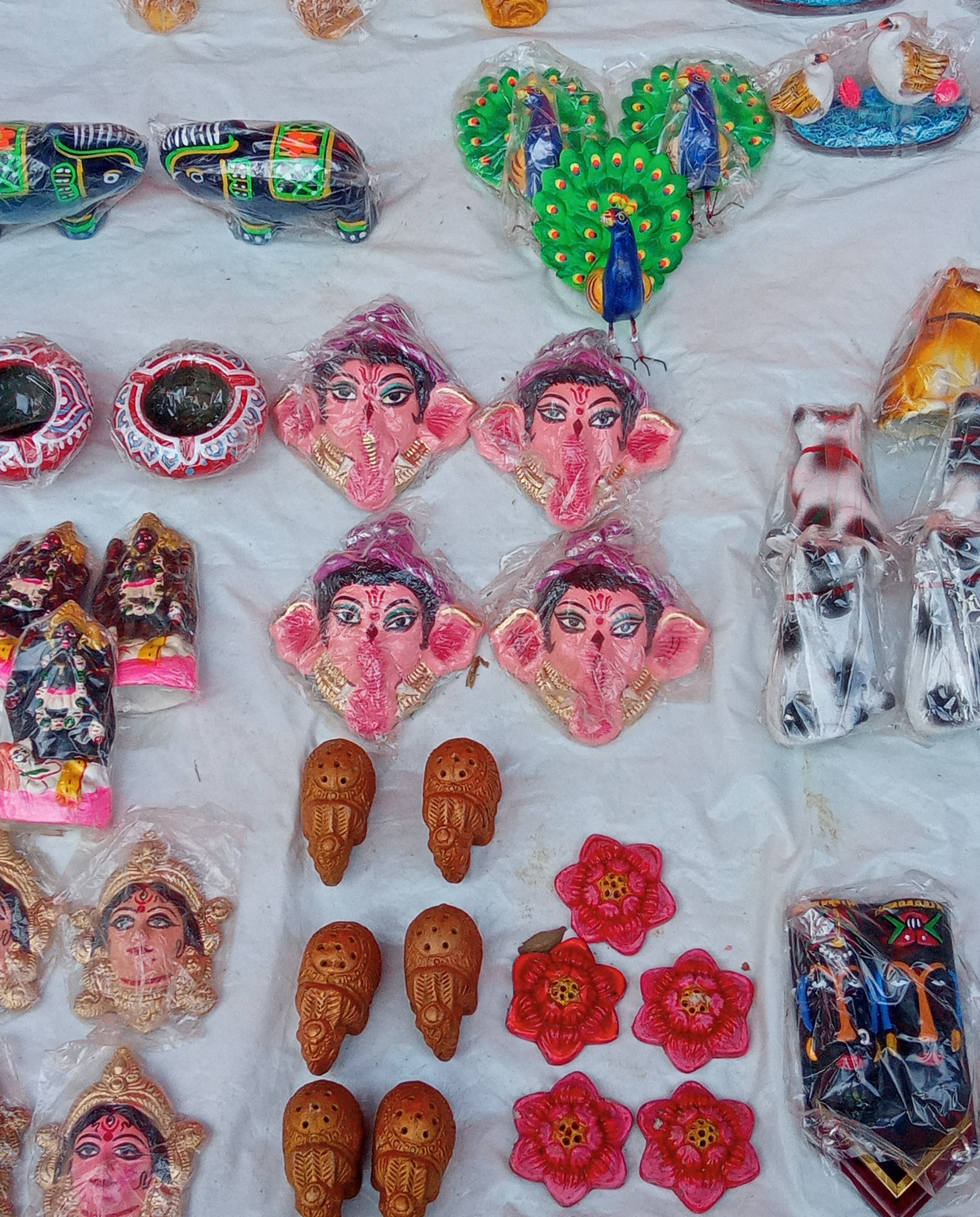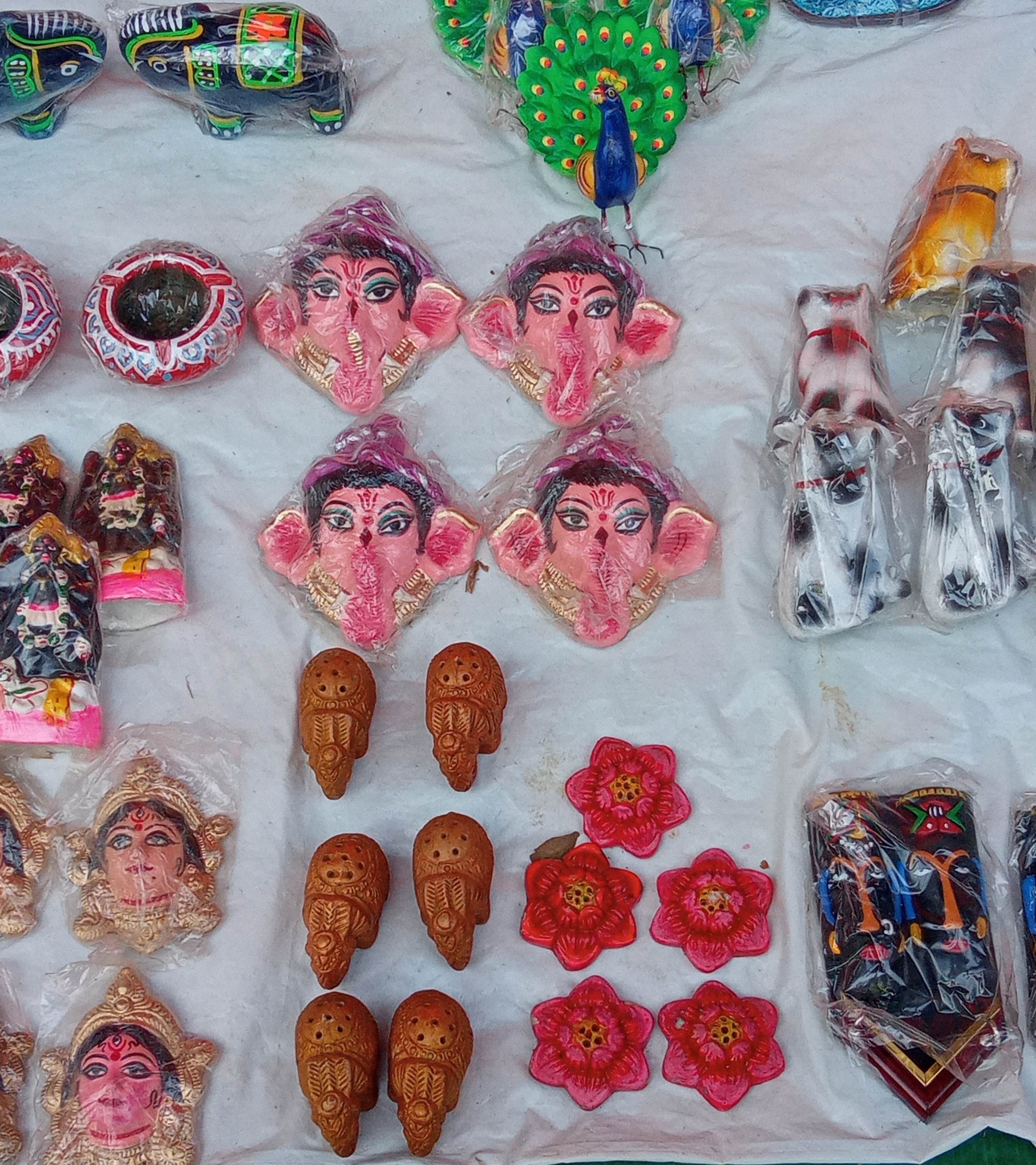 এখানে রয়েছে হাতি,দুর্গা মায়ের মুখশ্রী,মা কালীর মূর্তি,হাঁড়ি,গজানন,পদ্মফুল ও কুকুরের মূর্তি।প্রতিটি মূর্তির উপর রং-তুলি দিয়ে অসাধারণভাবে ফুটিয়ে তুলেছেন শিল্পীরা তার আকৃতিগুলো।এই সমস্ত ছোট ছোট মূর্তিগুলো ঘর সাজানোর ক্ষেত্রে দারুণ উপযোগী।
