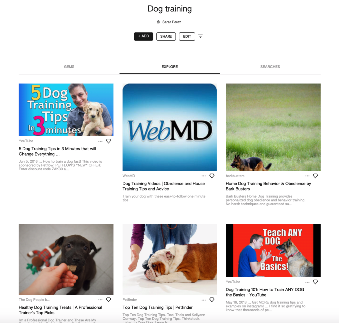 Keen 상태로 돌아오면 관심 있는 웹 콘텐츠에 링크 된 핀 보드 이미지가 표시됩니다. 개 훈련의 예에서, Keen은 기사 및 YouTube 비디오, 선별된 리소스 목록을 제공하는 블로그 게시물, 개 훈련 간식에 대한 Amazon 링크 등을 발견했습니다.