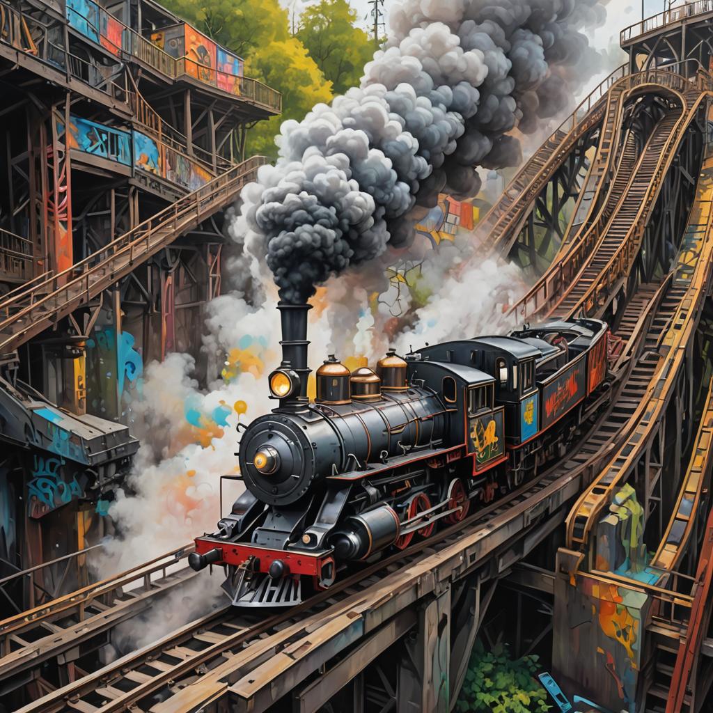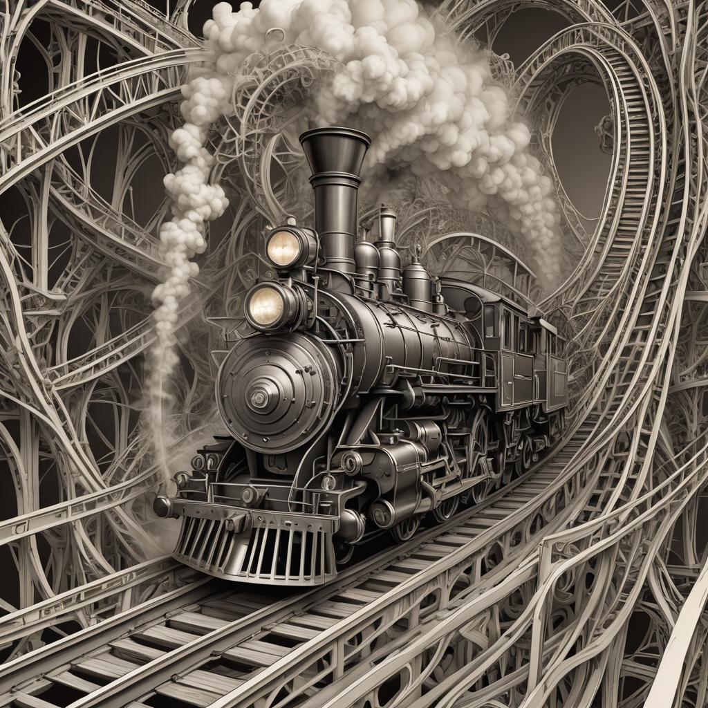Crypto's been a wild ride of late. So, I asked NightCafe to create images of a classic steam engine on a roller coaster. The first image uses Zentangles and fractals to create a wild rail road track. The second is more colorful.
