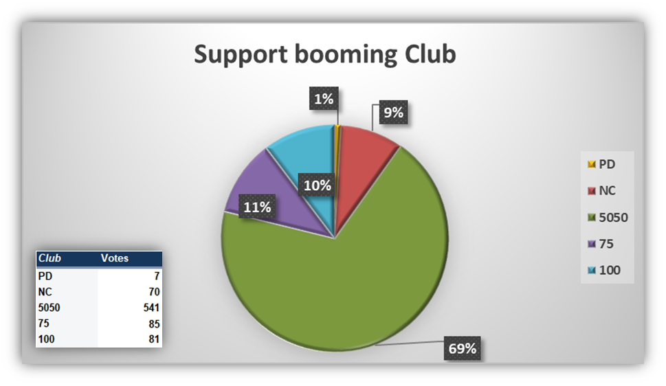 Below we can see the number of active posts and the number of Booming votes received per community, as well as the percentage of support relative to the number of active posts in that community.