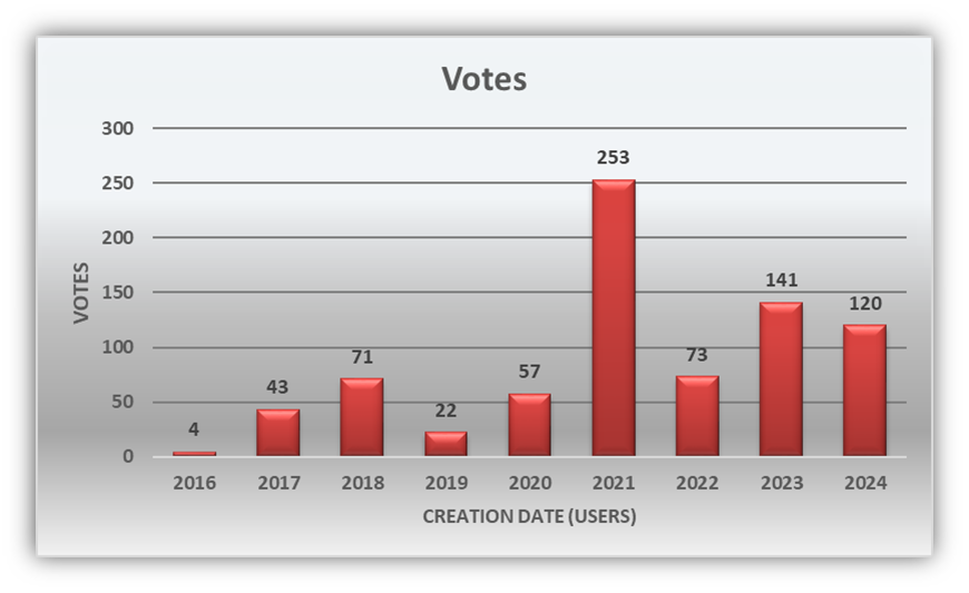 Below is a summary table of the community accounts and users with the highest number of votes received from the same community, information that may be relevant for the next distribution of votes. The results show a balance in terms of votes received by the community accounts. In relation to the users we can see an acceptable distribution, observing a decrease of users with more than 2 votes received by the same community.