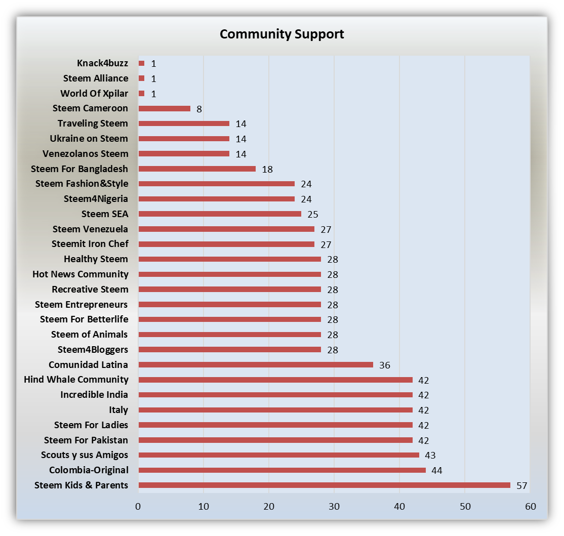 In this period we have witnessed an increase in terms of activity, some communities promoted dynamics that caught the attention of content creators, to the point of topping the list of active publications, such is the case of the Hind Whale Community, which has 274 active publications, followed by Steem For Ladies and Comunidad Latina, with their 242 and 208 active publications respectively. Among all the communities supported by the Booming program, there is an excellent figure of 3743 active publications (93 publications more than last week).