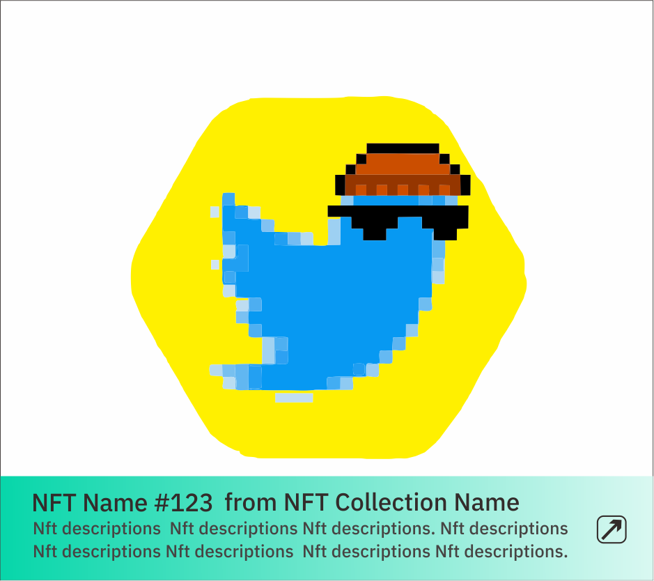 ↗ It is simple but must have the following informations about the NFT details, such as the tittle, Collection name, desscriptions and a "further details" button that will be heading to Opensea NFT market or Blockhain Explorer.