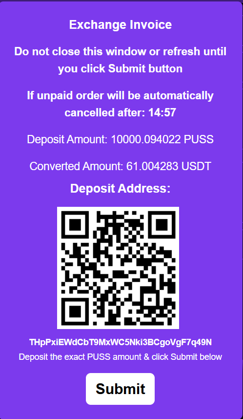 Complete the exchange invoice payment by following the instructions displayed on the screen and click on the Submit button. Remember you will get 15 minutes time to make the payment after the invoice is generated. Make the payment within this time and click the submit button. Do not refresh or close the page after paying the invoice. Click the submit button.