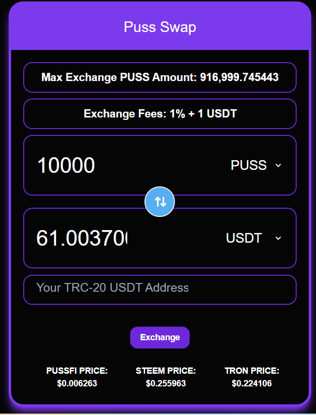 Convert your PUSS to STEEM, TRX and USDT very easily through this site. It will take only a few minutes to complete the entire process. First go to this link and open an account -