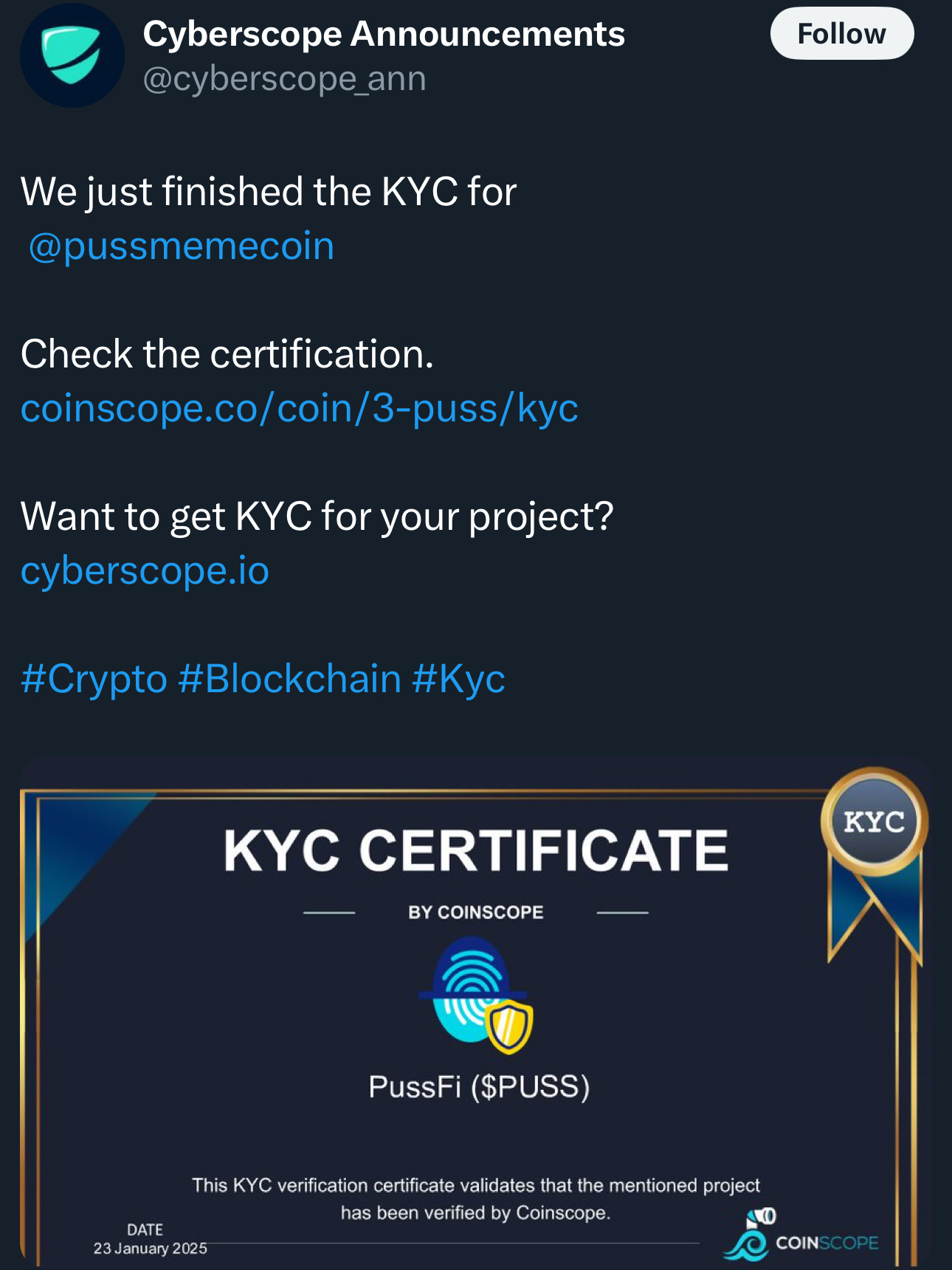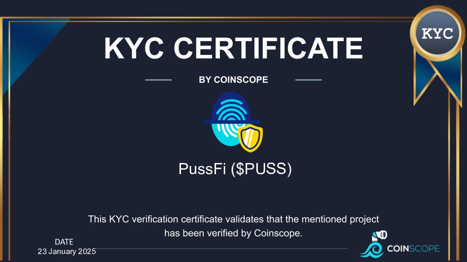 $PUSS - officially KYC-verified and certified by Coinscope