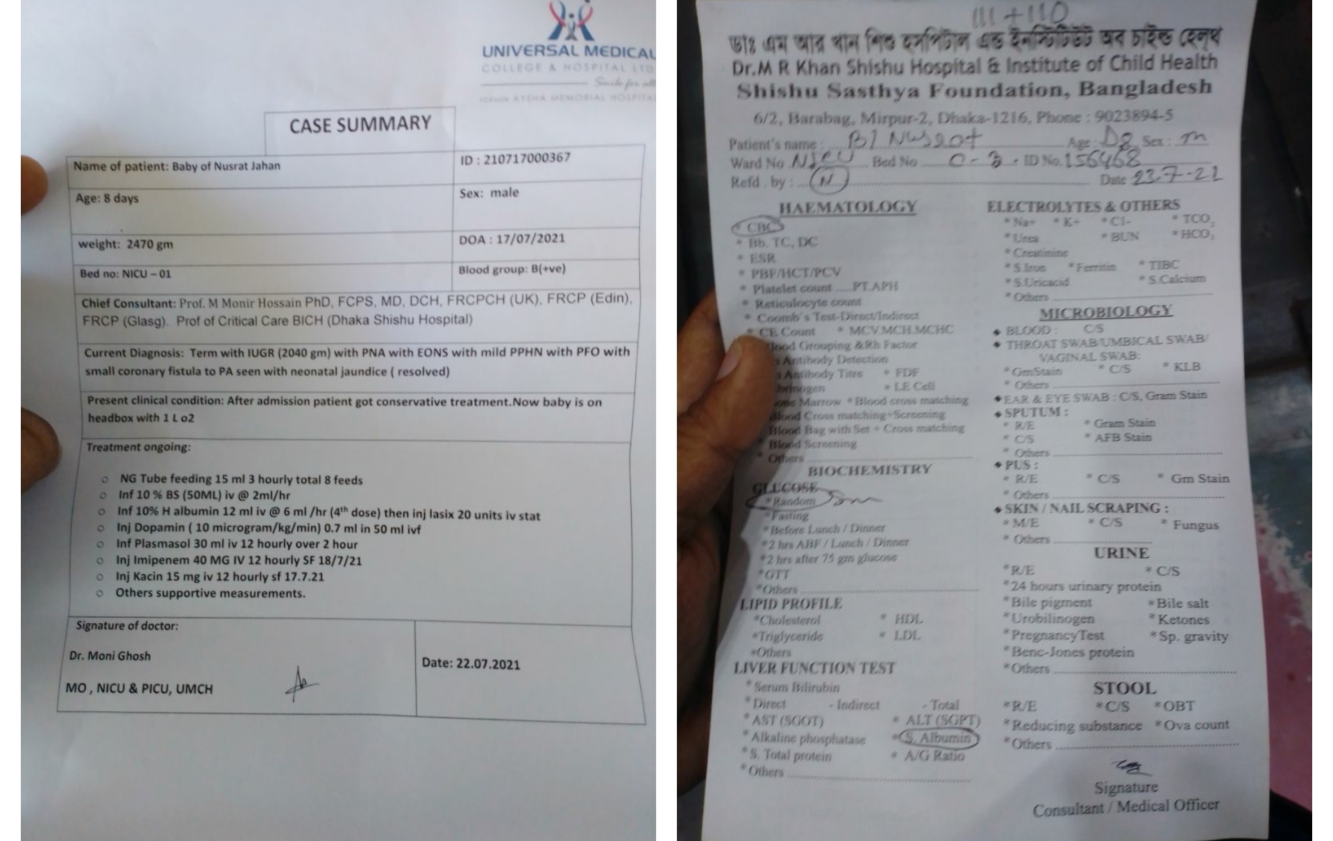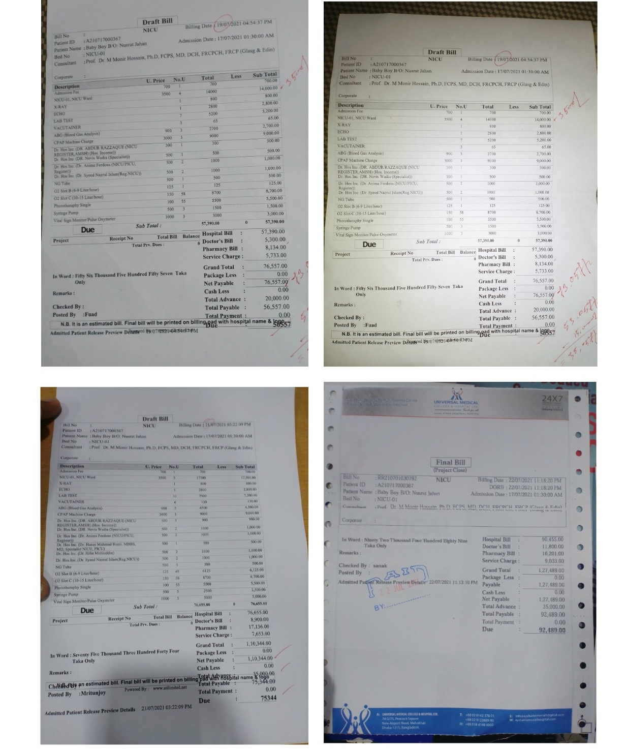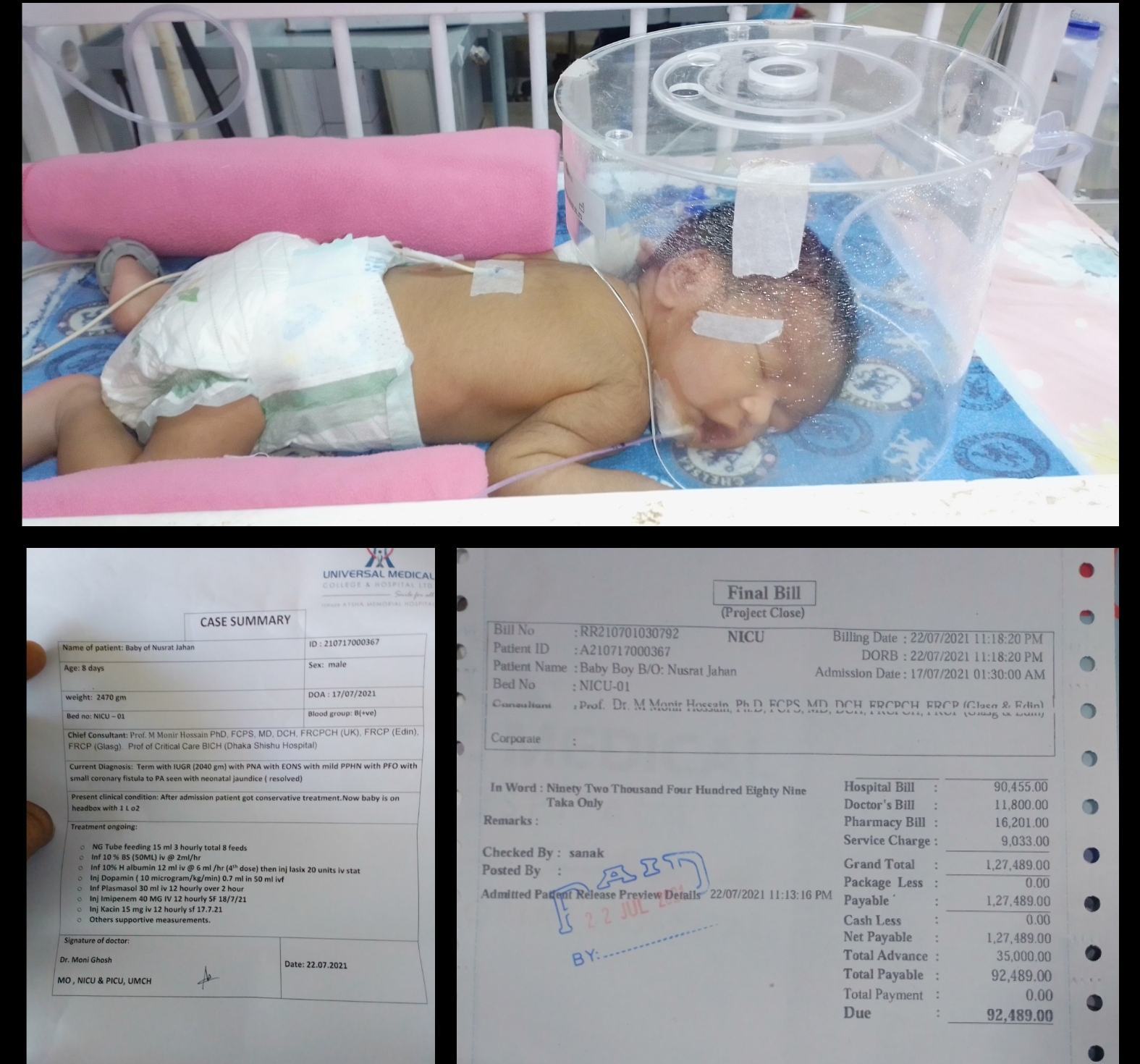 After staying in MR Khan Hospital for 4 days, the doctors there advised them to take the child to Ayesha Memorial Hospital for better treatment. The baby was later taken quickly to Ayesha Memorial Hospital on the advice of a doctor. Although the medical system there was good, but Emran Hasan's family could not continue the treatment of that child in the hospital due to the daily skyrocketing expenses. The baby was kept at Ayesha Memorial Hospital for a total of 4 days at a total cost of approximately 130,000 BDT (1500 USD) and more.