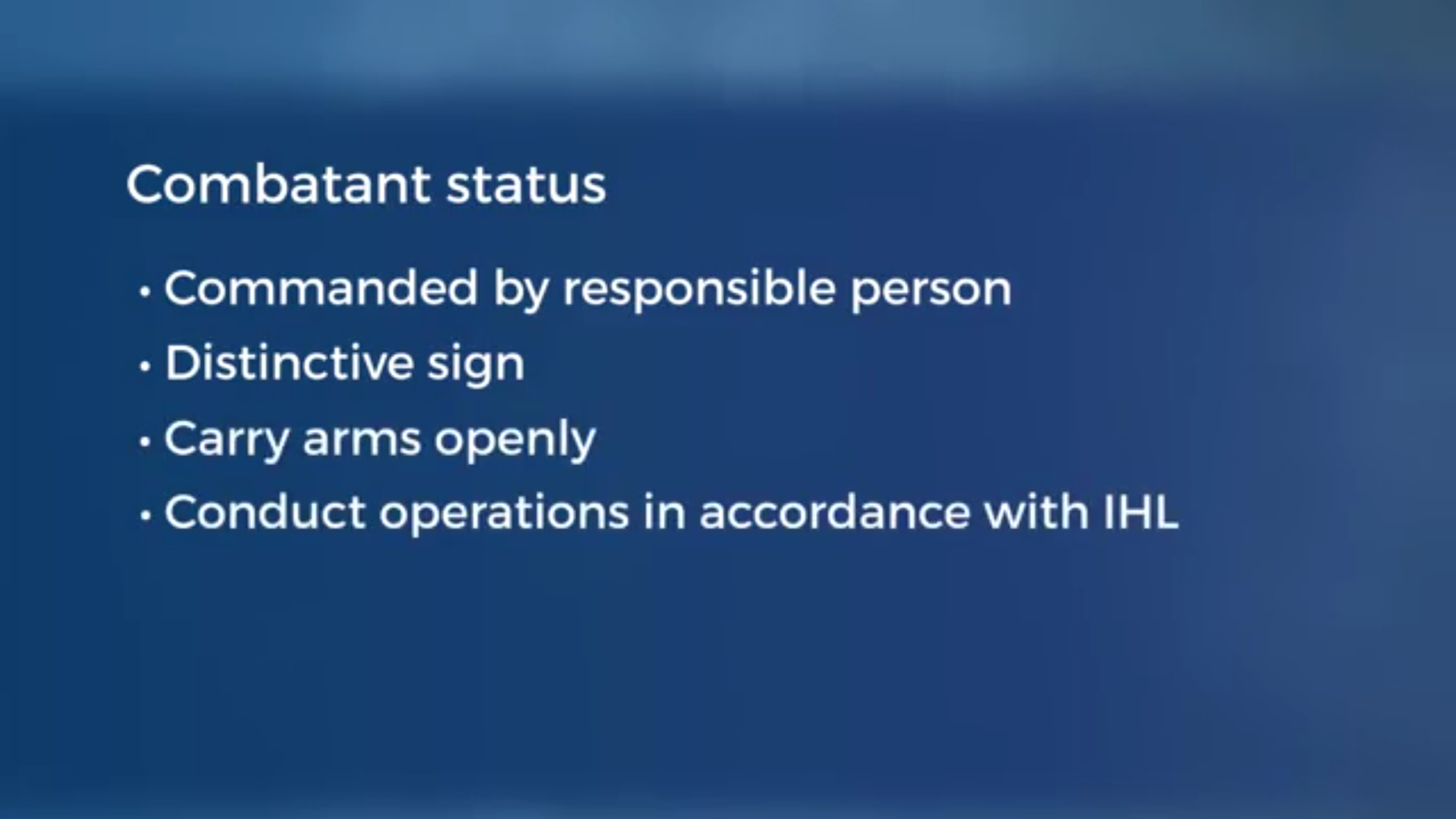My lectures was on the concept of A combatant. We made clarifications as to who a combatant is stating Clearly the indices taken into consideration for a fighter to be considered a combatant and these include.