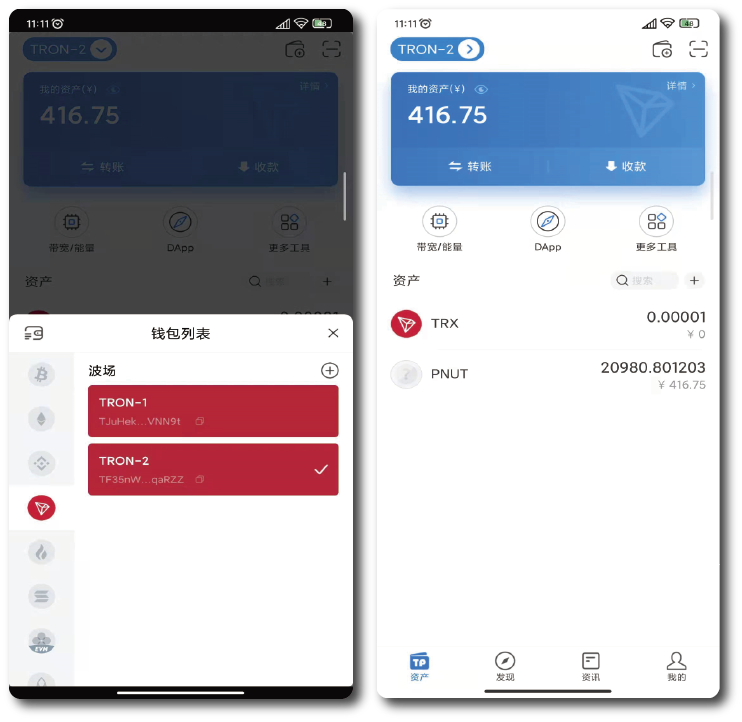不用考虑更新波宝Pro以及Tron link,更新也是老样子,最简单的方法就是将自己持有PNUT资产的Tron账户导入到TP钱包当中。