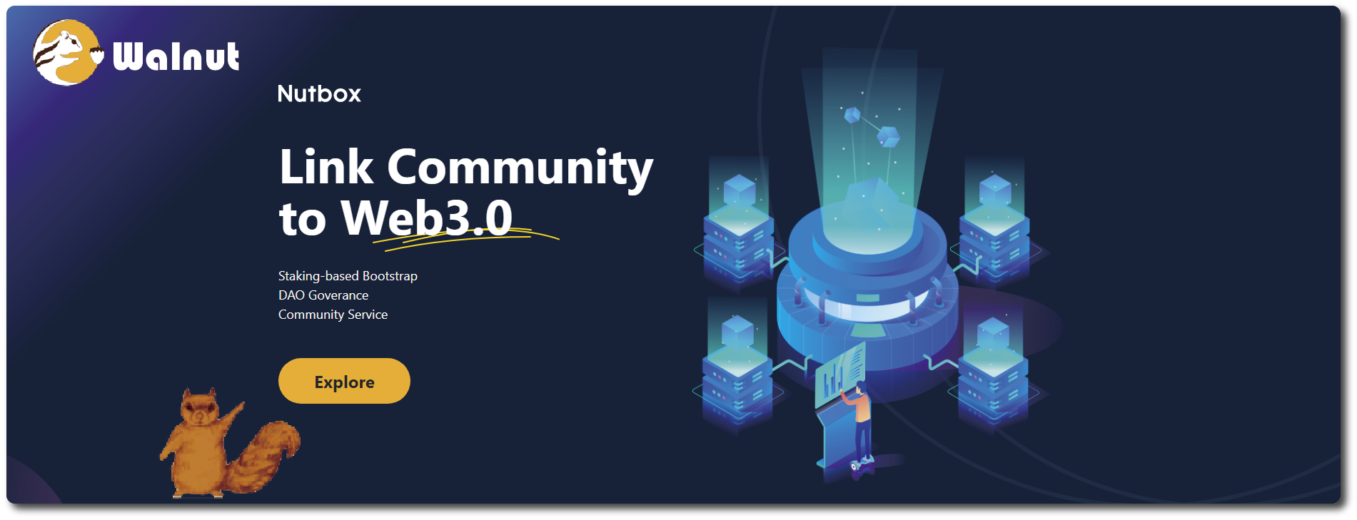 Nutbox Walnut 立足于 CommunityFi,以社区为中心,为社区提供一系列工具,帮助其开启并运营 CommunityFi。借助于Nutbox提供的Crowd-Staking Protocol, Community Service & Plugins Store和 Governance Factory,社区可以像在Uniswap上创建交易对一样轻松实现社区自举、自治并产生价值。