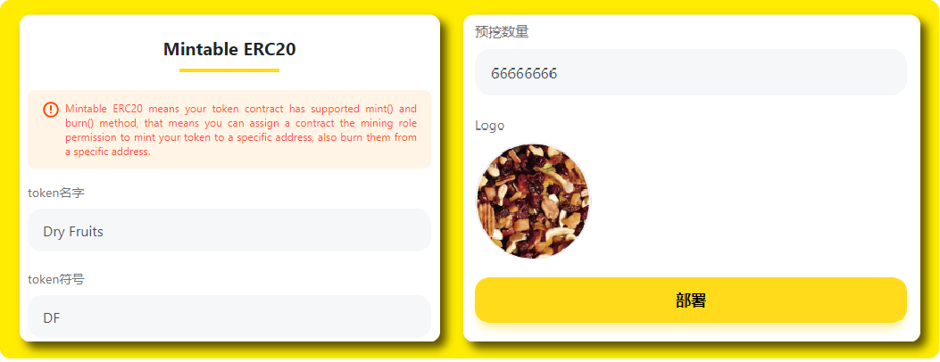 接着在「Mintable ERC20」界面填入「token名字」、「token符号」、「预挖数量」 以及 上传「Token Logo」,最后点击「部署」。