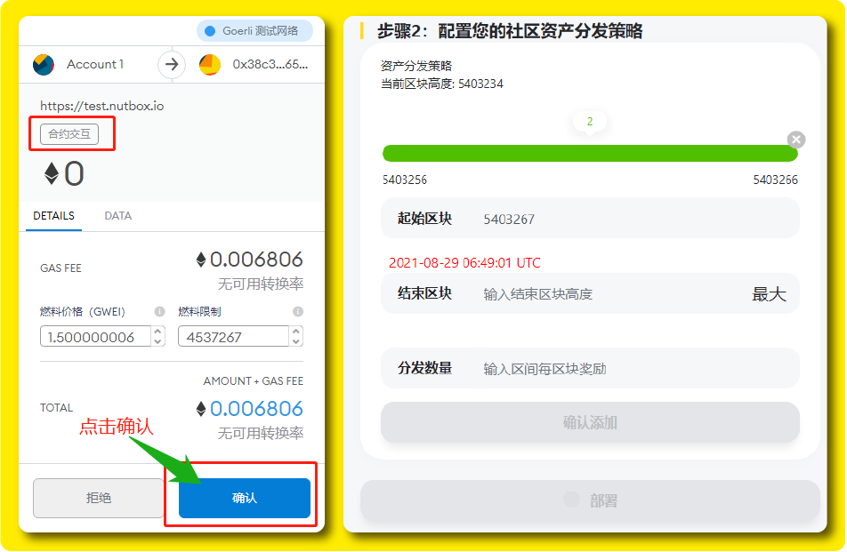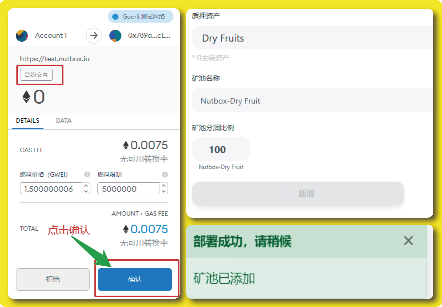 接着MetaMask钱包会跳出提示框进行「合约交互」,我们直接点击「确认」,点击确认后稍等片刻便会部署成功,最后会显示绿色提示「矿池已添加」。