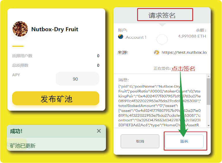 跟着我们需要在所添加的矿池中输入年化收益率,然后点击发布矿池,随后MetaMask钱包会跳出提示框进行「请求签名」,我们直接点击「签名」,稍等片刻便会出现提示信息,提示「矿池已更新」。