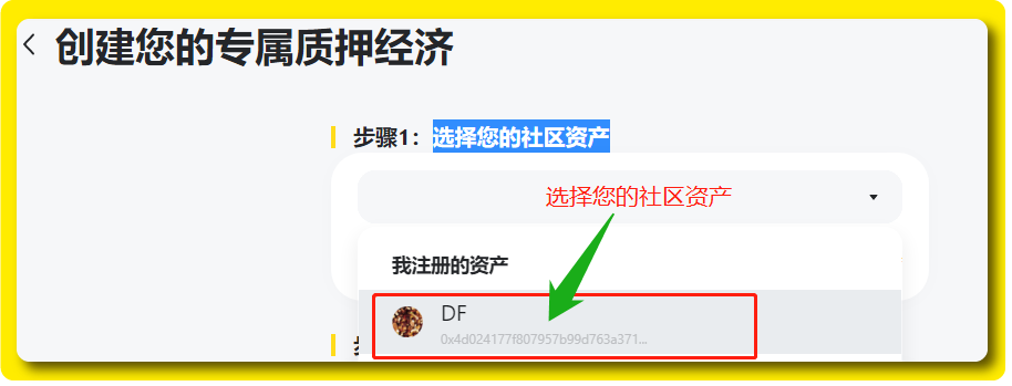 当社区资产注册成功后会跳转至「创建您的专属质押经济「页面,其中步骤一要求用户选择社区资产,这里选择之前部署注册的社区资产就好。