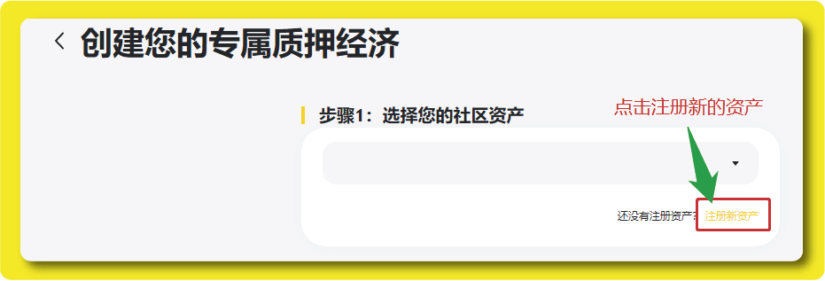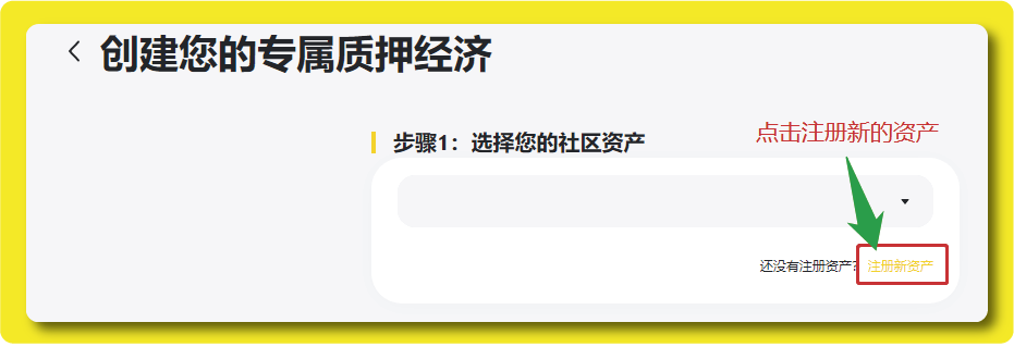点击「开始创建」后会跳转页面至创建您的专属质押经济页面,我们第一步需要先** 注册新资产**,直接点击还没有注册资产?后面的黄色字体—— 注册新资产