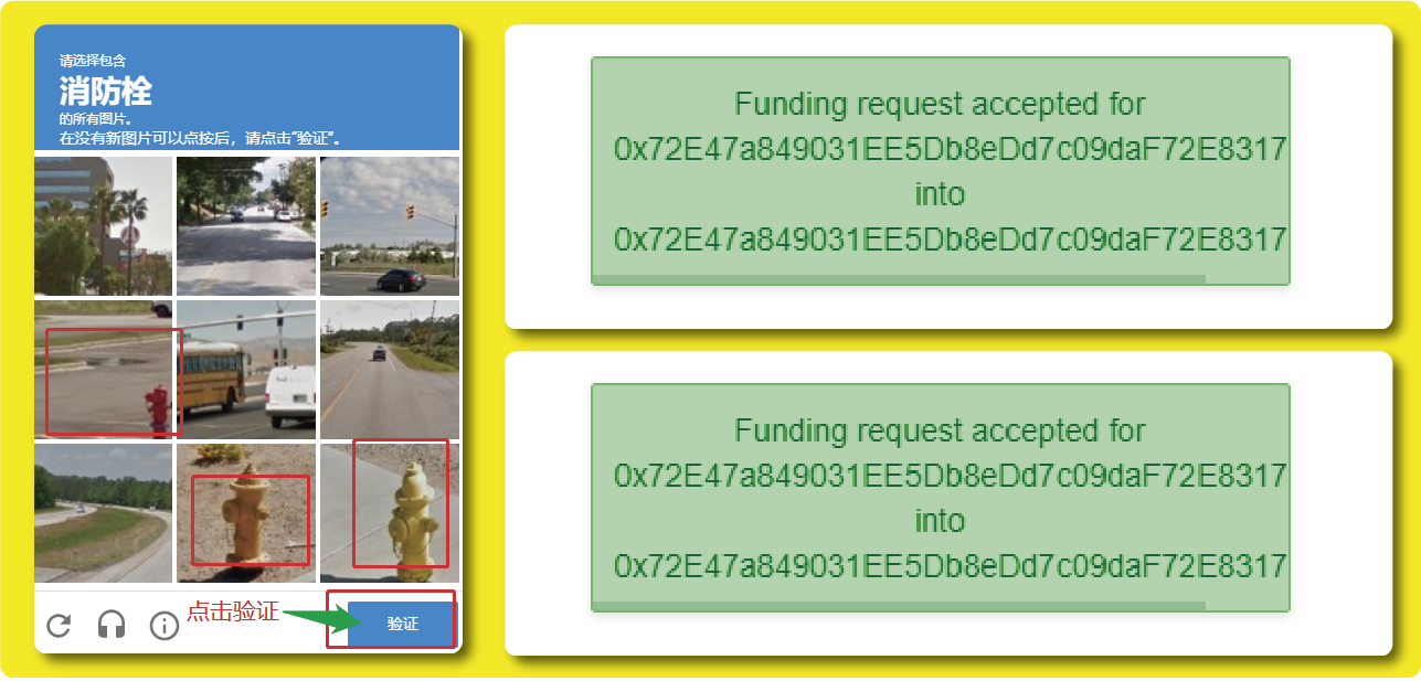 点击「37.5 Ethers / 9 days」后需要进行谷歌安全验证,主要是选择同一属性的图片,验证通过后会显示绿色字体「Funding request accepted for... ...」,之后你便可以获得37.5ETH测试币,然后9天后才可以再次申请。