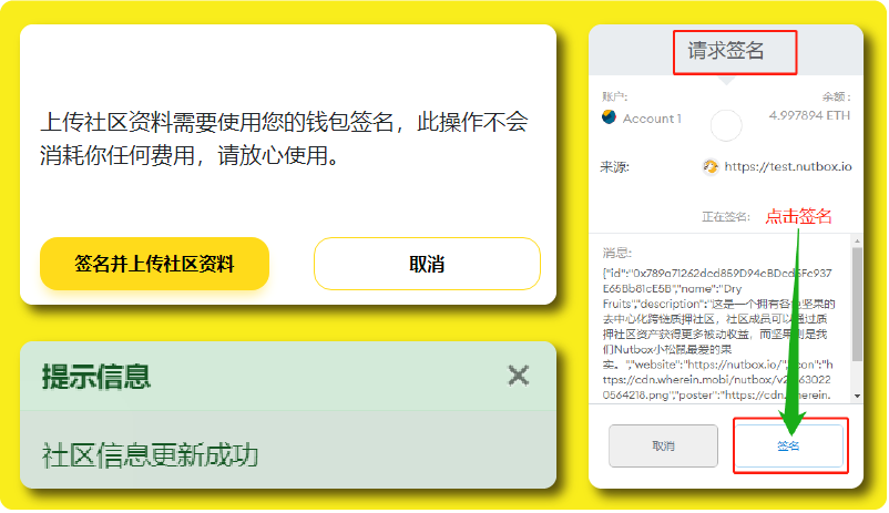 点击「提交」后我们需要点击「签名并上传社区资料」,而后MetaMask钱包会跳出提示框进行「请求签名」,我们直接点击「签名」,随后便会出现提示信息,提示「社区信息更新成功」。
