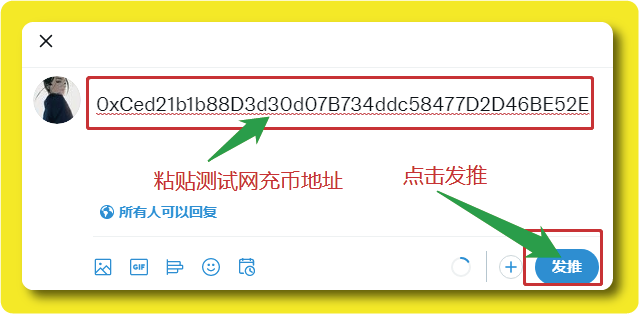 之后会跳转至Tweet发文页面,将你的Goerli测试网的充币地址复制粘贴到发文处,点击「发推」。