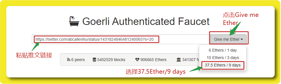 然后将所复制的推文链接粘贴至ETH水龙头的框框里,点击「Give me Ether」,接着点击「37.5 Ethers / 9 days」。