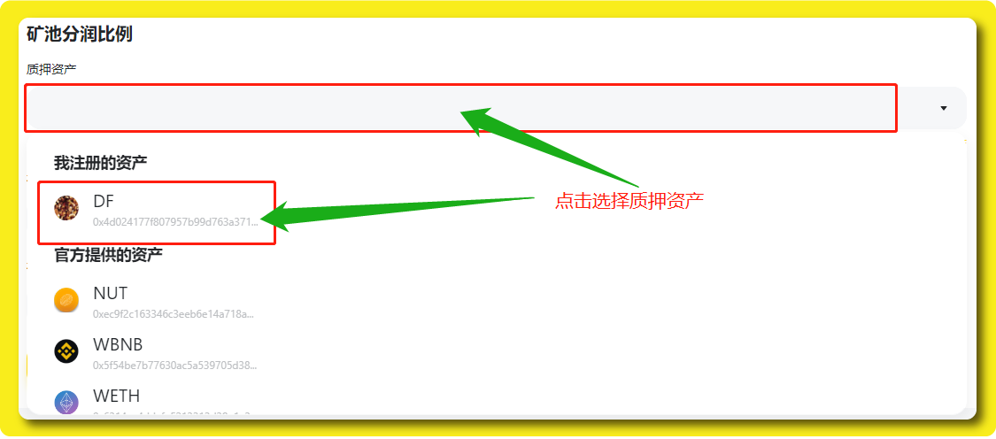 接着在「创建矿池」中先选择质押资产,这里选择之前部署注册成功的就好。