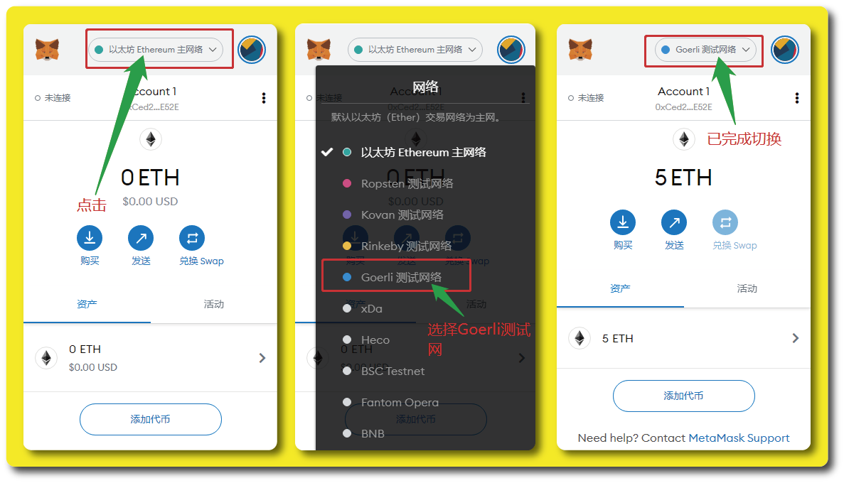 我们只需要点击MetaMask钱包上方的以太坊 Ethereum 主网络,然后选择「Goerli测试网」就可以完成切换。