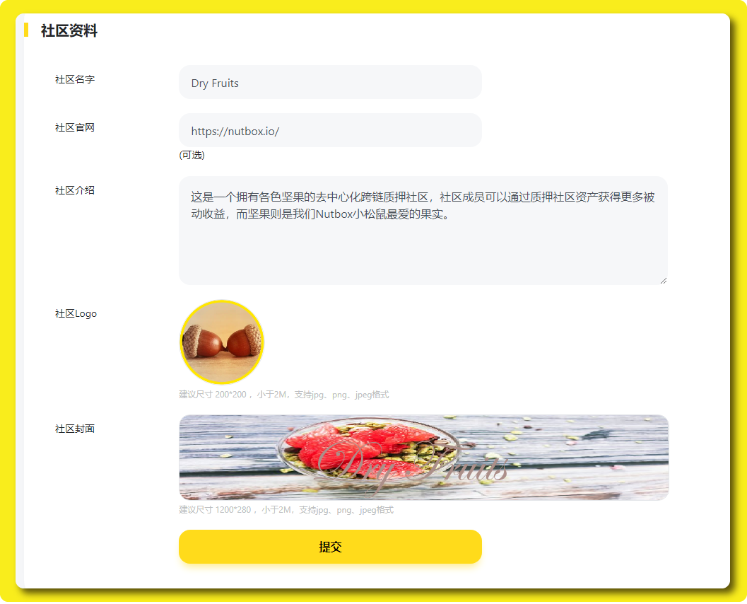 之后我们需要完善社区资料,我们分别需要设置「社区名字」、「社区官网(选填)」、「社区介绍」、「社区Logo」、「社区封面图」,最后点击「提交」。