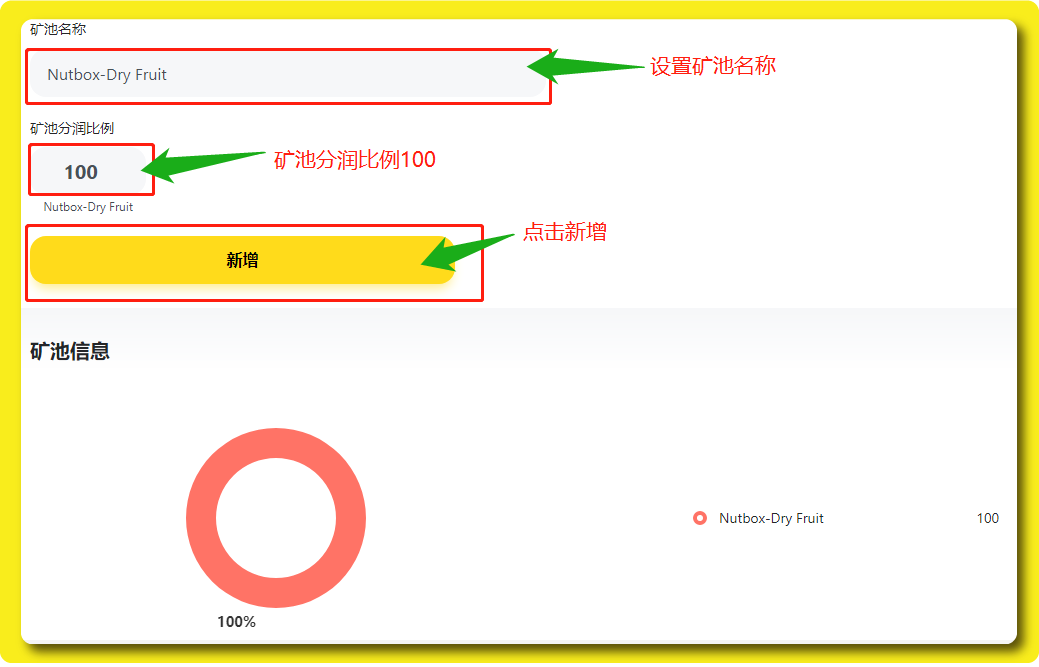 随后我们需要设置一个矿池名字,然后矿池分润比例为100不变,最后直接点击「新增」。