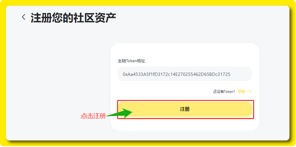 当我们成功部署社区资产后我们需要注册所部署的社区资产,当我们部署完成后会跳转页面至「注册您的社区资产」,我的所部署的资产的合约地址也会出现在框里,我们只需要点击「注册」。