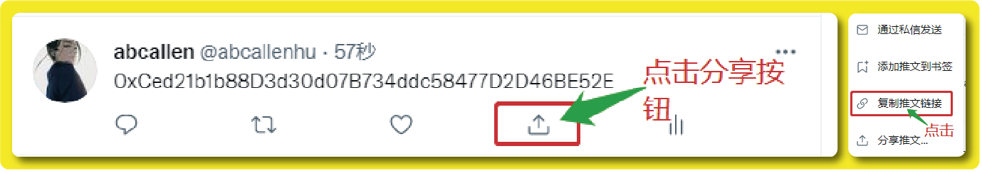 发推之后点击已发送推文下方的「分享按钮」,然后点击「复制推文链接」。