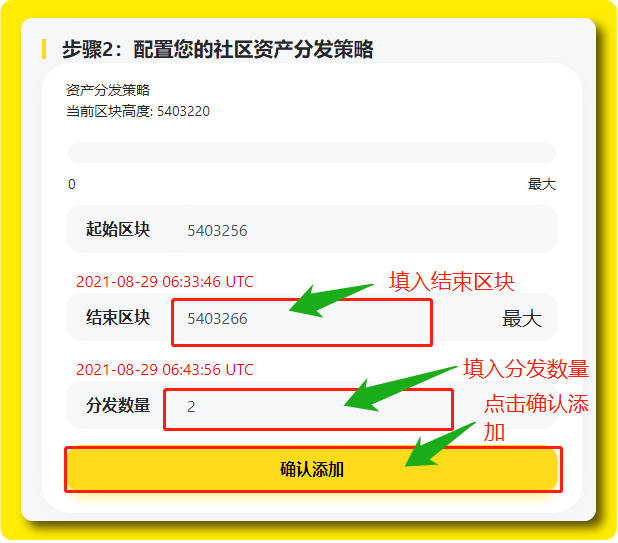 完成步骤一之后接着轮到步骤二,我这是需要填入「结束区块」,以及「分发数量」,最后点击「确认添加」。