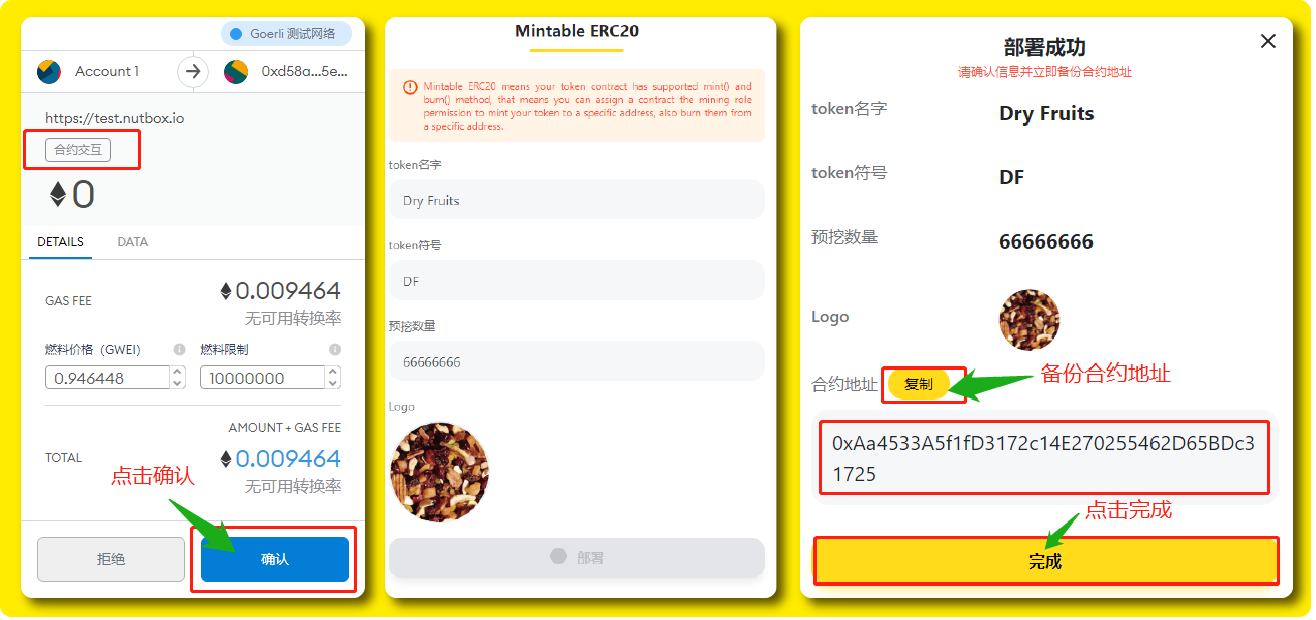 注:部署成功后记得复制合约地址备份