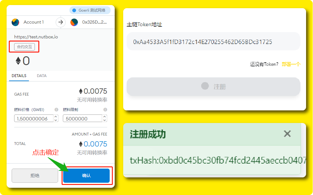 点击「注册」后MetaMask钱包会再次跳出提示框进行「合约交互」,我们直接点击「确认」,随后稍等片刻页面右上角便会提示「注册成功」。