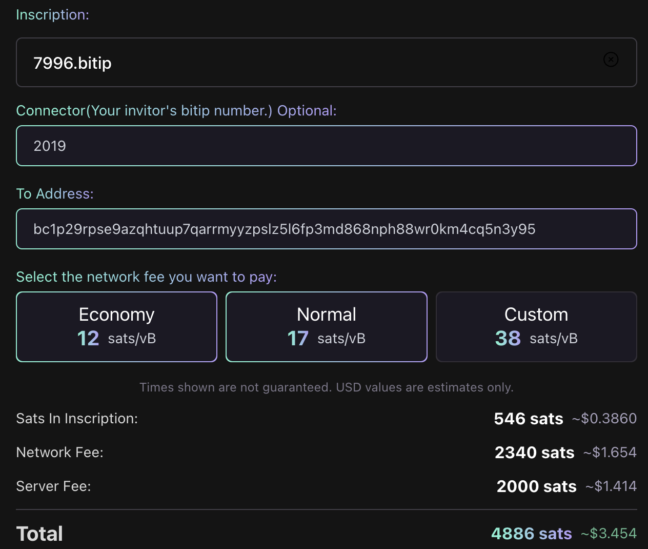 需要注意的是BTC区块10分钟提交一,因此可能要等一会铭文才能确认。