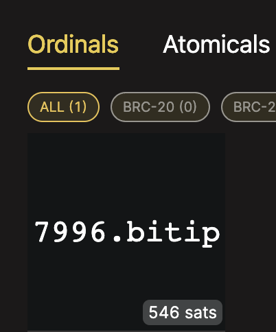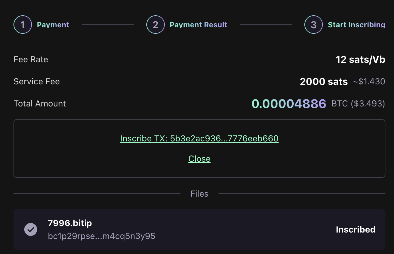 铸造完毕后有transaction ID。然后可以打开UniSat wallet就可以看到铸造后的bitip铭文了。