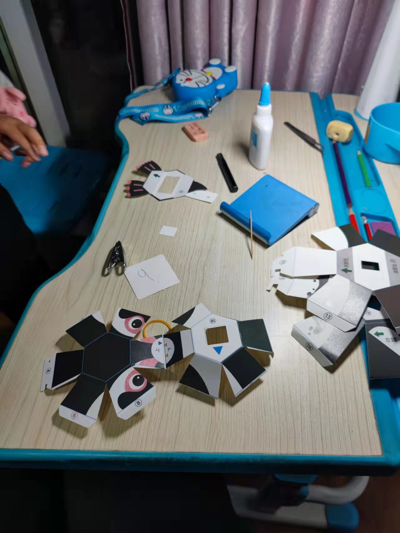 由于厂家已经预先把部件边缘留好了刻痕,所以不用裁剪,只用把还没刻断的地方撕扯开就行了,所以大部分动手的活都交给小宝贝自己弄了,我主要对照说明书指导一下怎么组装,以及最后在肚子里,和脑袋里套橡皮筋的工作,因为要用到镊子等工具,套橡皮筋这道工序对小朋友来说还是挺难的。