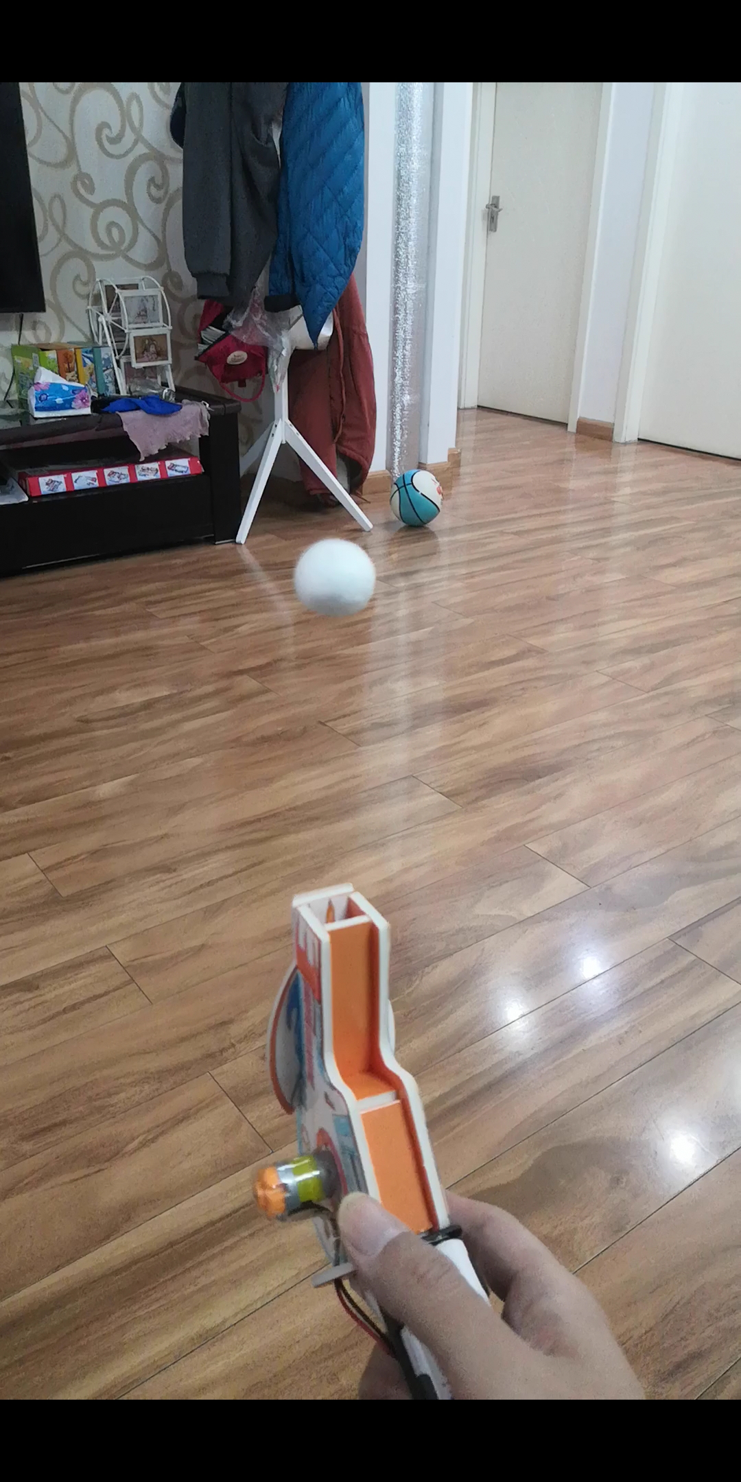 这套套件设计挺有意思,不光是手工,首先要小朋友们自己给皮肤涂色,然后贴到纸板上。涂色什么的,小宝贝最喜欢了。两个人一人一张,高高兴兴的开始干活。我就去忙我的事去了,等我回来,小宝贝的表姐已经走了,做了一半的鼓风机扔在书桌上。看来还是得我来收尾,原来鼓风记得纸板卡口设计的很紧,鼓风机要求封道要密封良好,不能漏风,很多地方要用很大的力气才能卡好,两个小朋友力气都不够。我研究了一下说明书,按照要求把鼓风机完成了。合上开关,运行正常,枪口状的出风口真的有风。这个鼓风机还有一个有趣的玩法,就是把一个泡沫球放在出风口,就能悬停在半空中,就像磁悬浮和科幻中的反重力一样。
