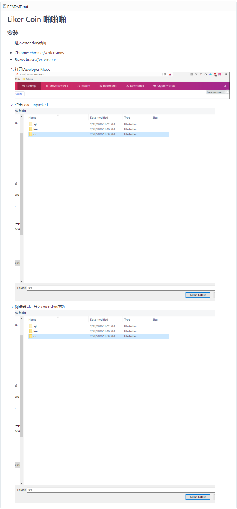 代码资料库里面有介绍如何将扩展程序安装到自己的浏览器上(如图)。