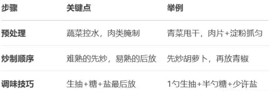 爆香调料 → 难熟的先下 → 易熟的后放 → 最后调味