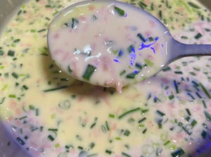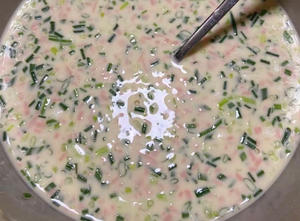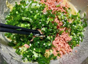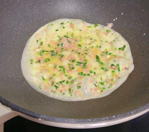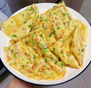 葱花火腿鸡蛋软饼steemCreated with Sketch.xtt (43)in STEEM CN/中文 • last year 用料 鸡蛋 2个 中筋面粉 250克 火腿 半根 葱花 3根 水 500克 盐 适量 五香粉 少许 鸡精 少许 1.鸡蛋打散 加入面粉 搅拌成无颗粒状的面糊 再加入葱花火腿 搅拌均匀,加入清水 盐,五香粉,鸡精少许混合均匀 不粘锅烧热,刷一层油,放入一勺面糊快速摊平 煎制表面凝固起泡后喷一点油翻个面 继续烙一分钟 两面金黄即可 装盘开吃 #gfcn