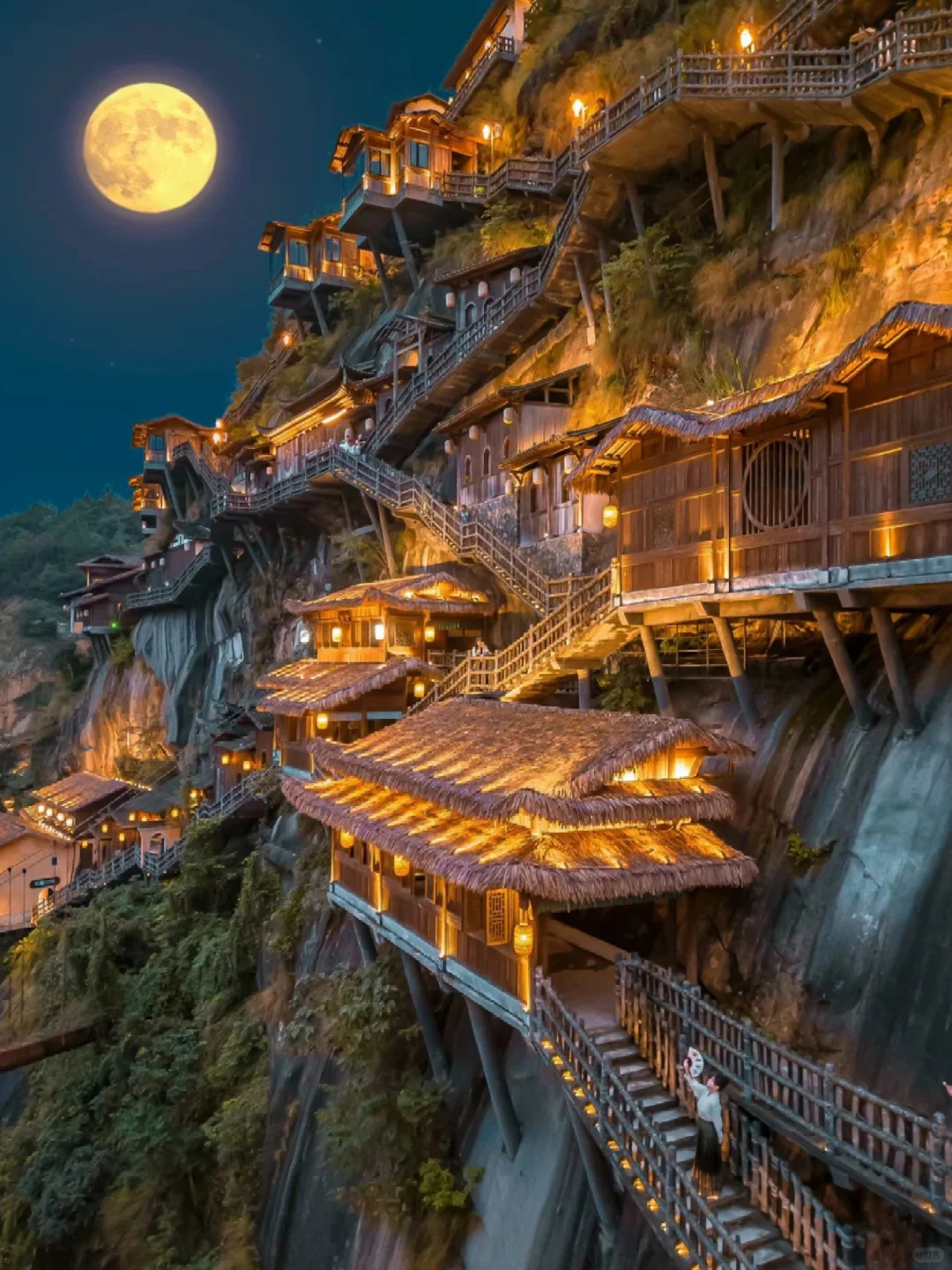 悬崖峭壁,山水之间,夜晚有多好拍不用说,灯光下的望仙谷绝绝子~