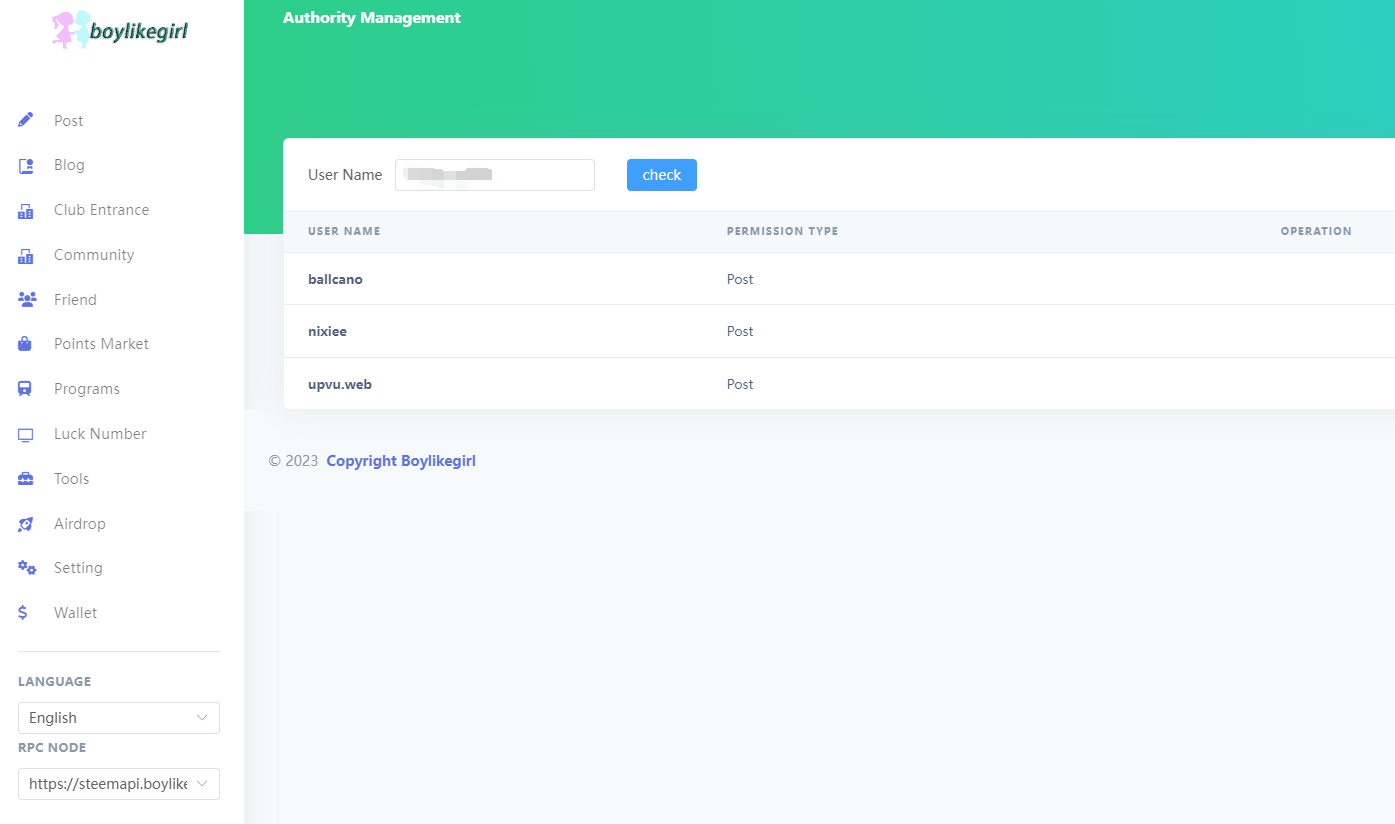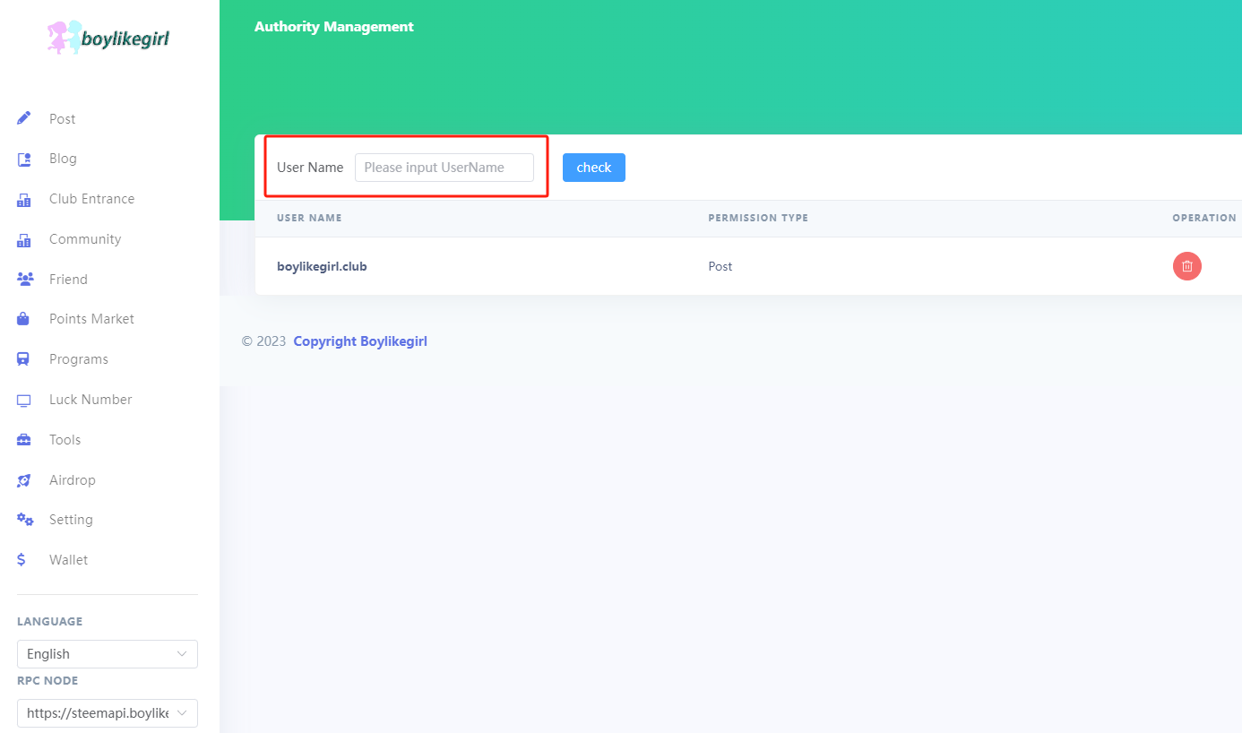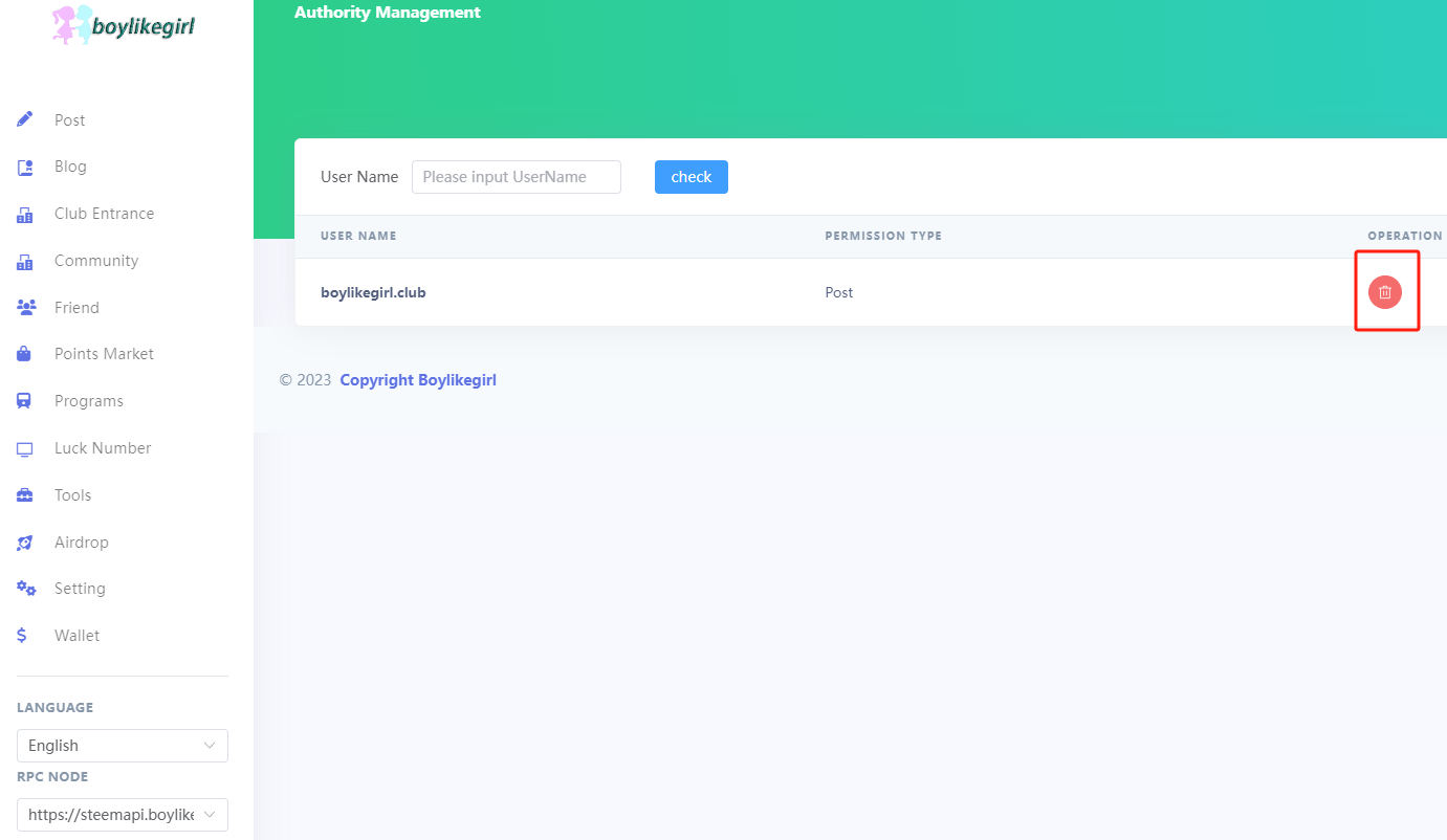 Here, the authorization list for the currently logged-in account will be displayed by default. You can see that our witness account has granted the club POST permission. The trash can icon next to it signifies that you can revoke this authorization.