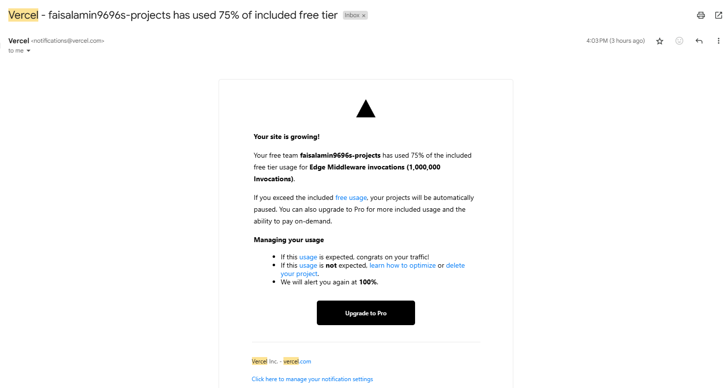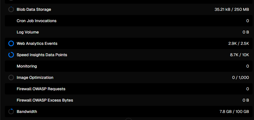 Here we can observe that the project is approaching its limitations, with middleware usage surpassing 75% of the free quota.