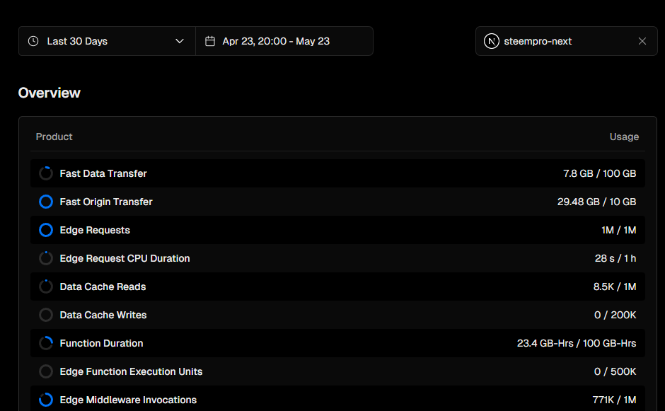 Hello everyone, the number of SteemPro users is growing steadily, and the production code adequately handles high traffic. However, additional hardware resources are needed. Currently, the free plan usage is nearing its capacity. If the limit is exceeded, the SteemPro project may be paused, or certain functions, particularly the middleware, may experience issues.