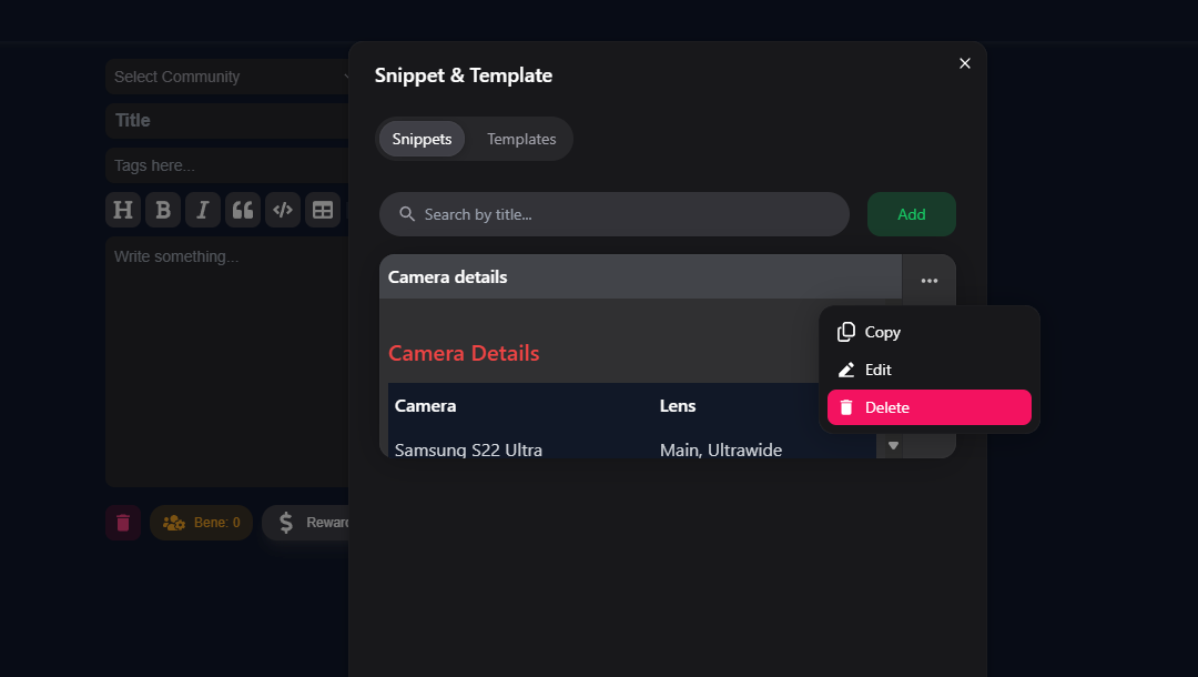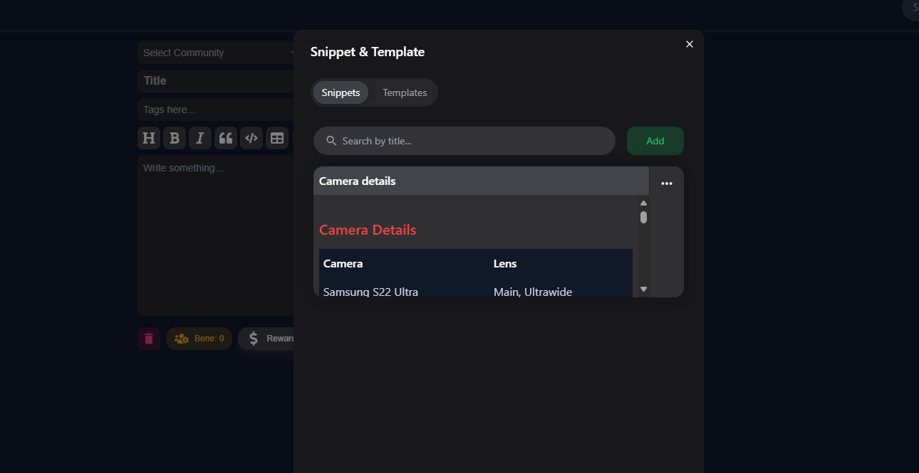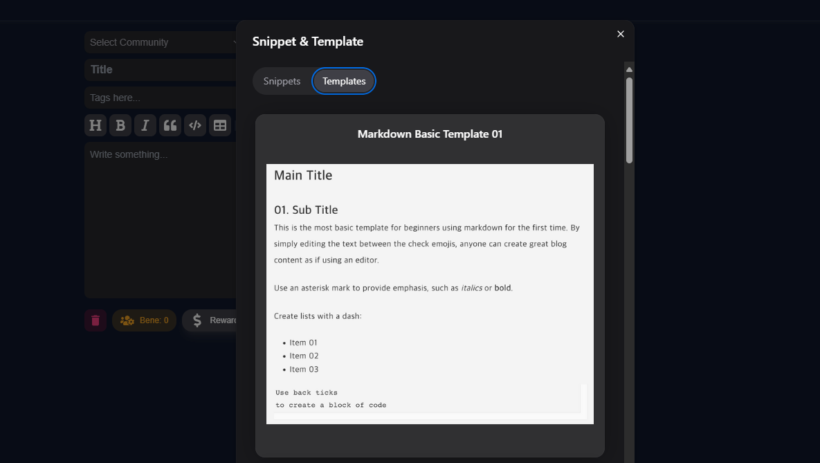 Moreover, snippet data is securely stored in the cloud, allowing you to access your snippets anytime, anywhere. Templates are also available, just like on Steemit, and our team is actively working on adding more flexible templates in the future.
