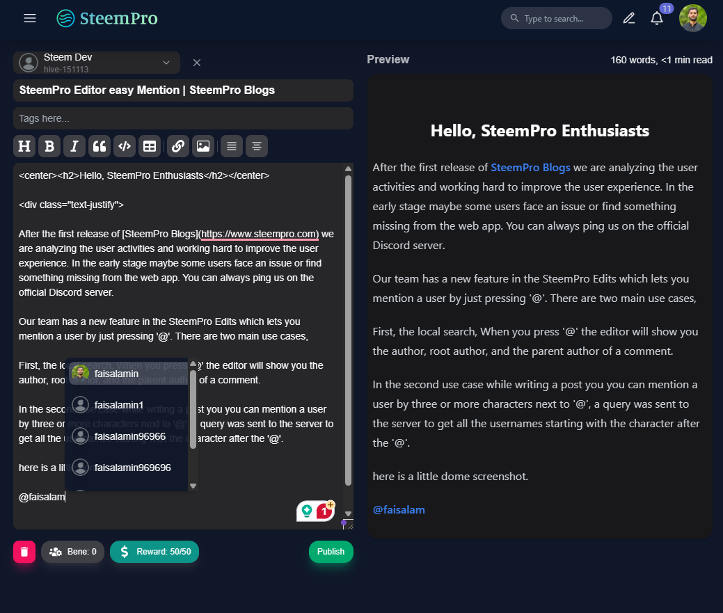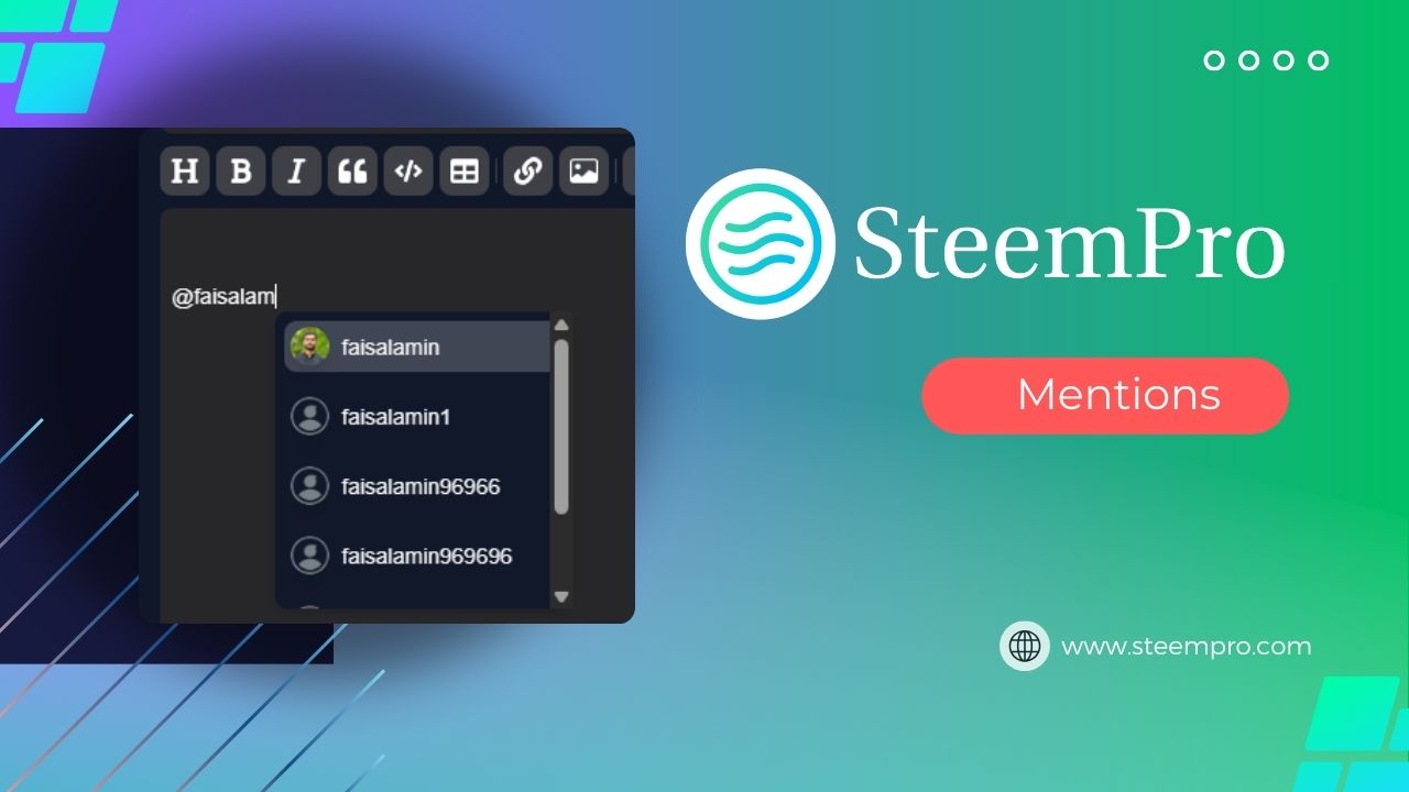 Our team has added a new feature to SteemPro Editor that allows you to mention a user by simply typing '@'. There are two main use cases.