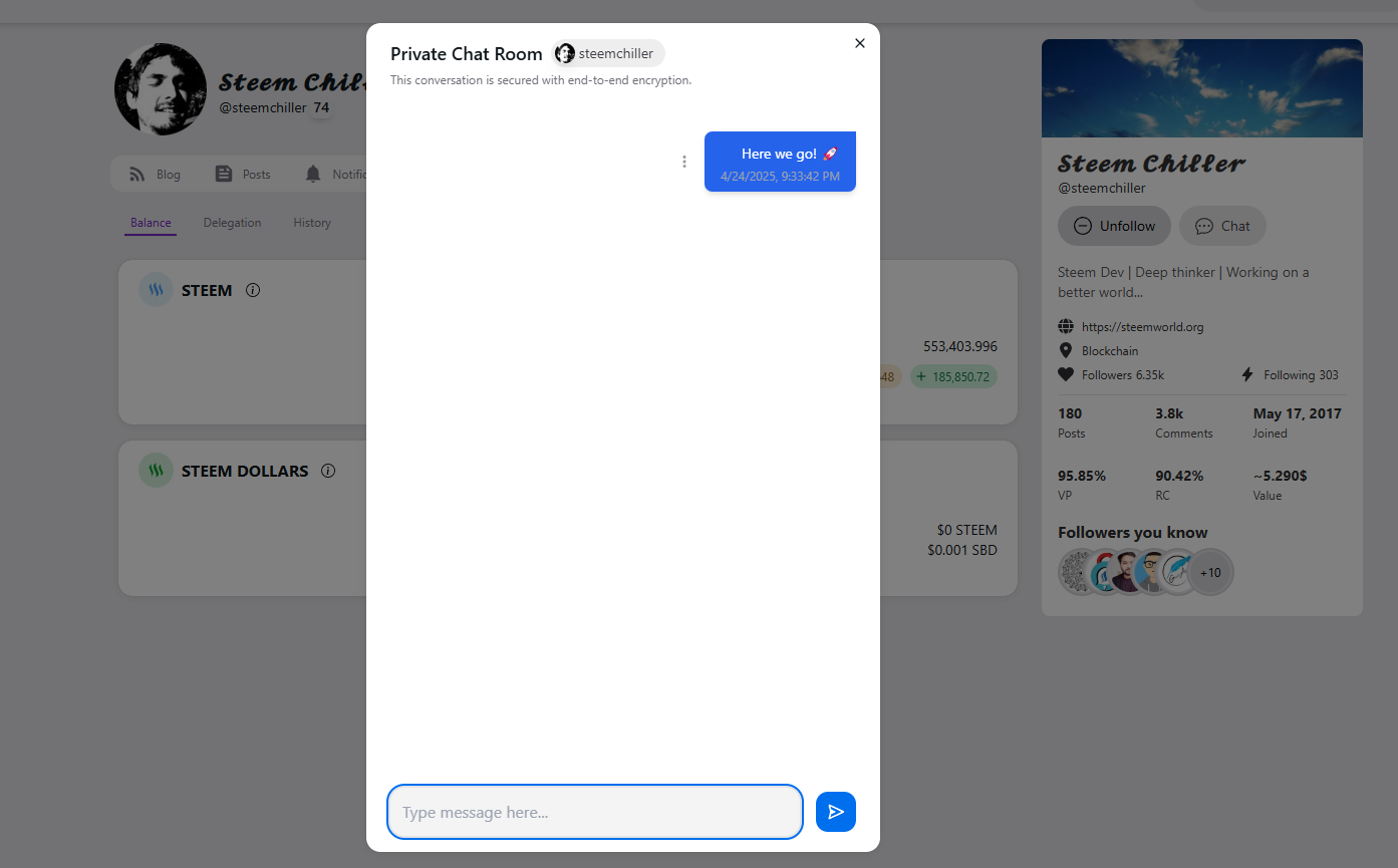 This powerful addition allows users to chat one-on-one with complete end-to-end encryption, ensuring total privacy and security across the Steem blockchain. Your messages are encrypted using your Memo Key and can only be read by the intended recipient, not even we can see them!