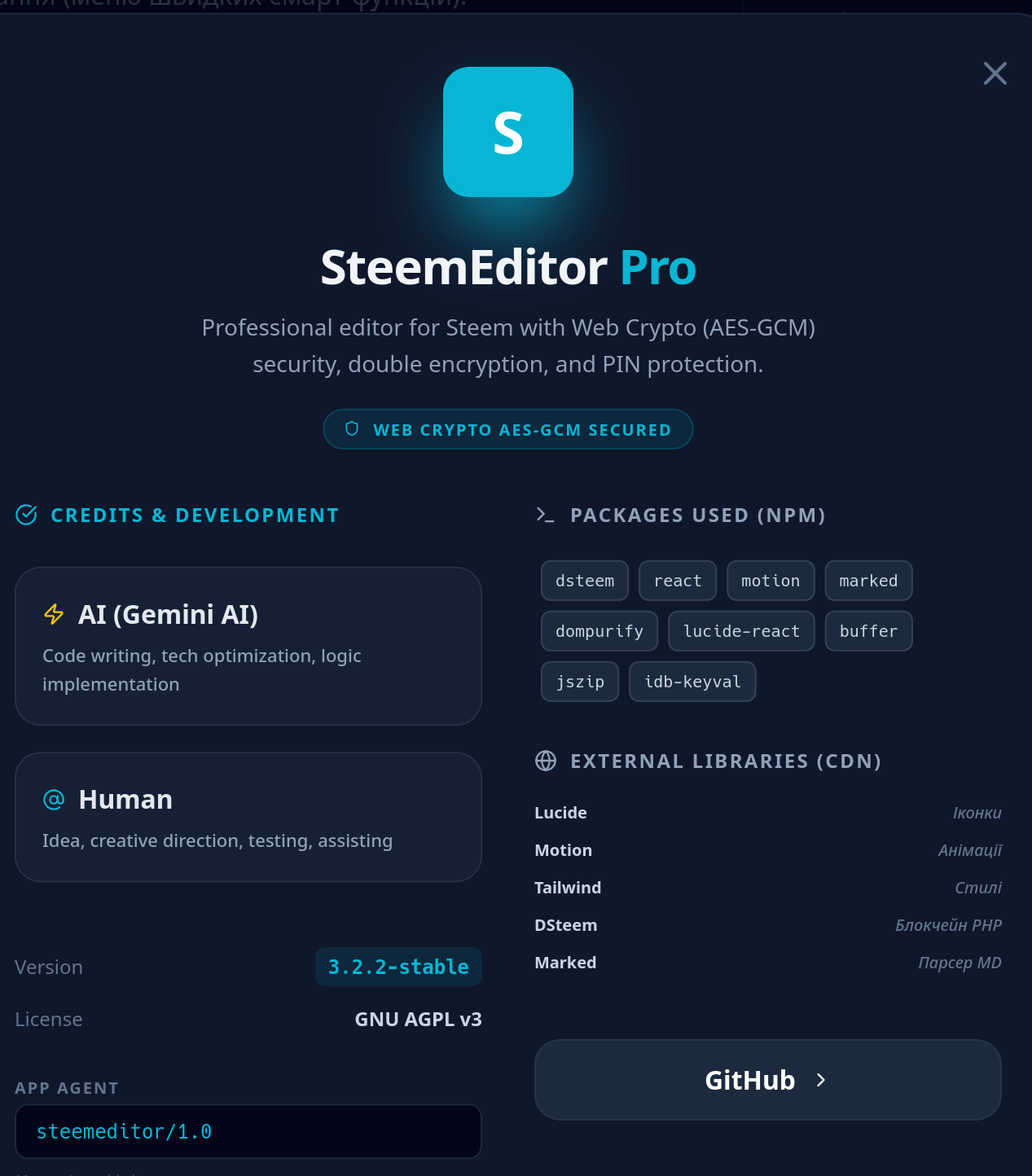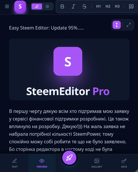 First of all, I want to thank everyone who supported my application in the developer financial support service. Your support truly influenced the development process. Thank you! ))) Unfortunately, the application did not gather the required amount of SteemPower, which actually gave me the freedom to implement things that weren't initially declared. I stopped developing the editor page in pure code because I fell in love with React and its capabilities. Although it’s not as simple to run locally and contains additional files after the build, it is definitely worth it.